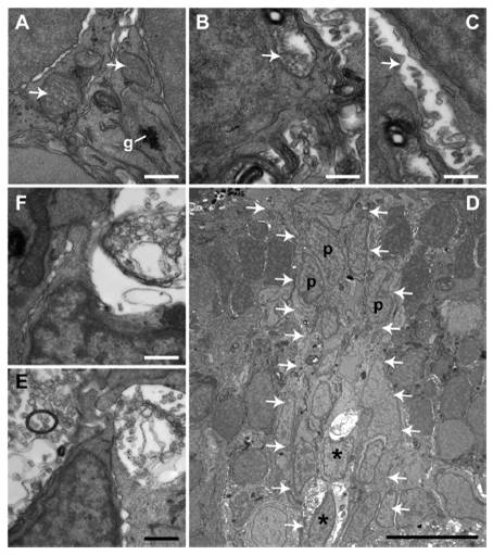 Fig. S6 Transmission electron micrographs of mitochondria in injury-activated Müller glia in WT siblings and nbl mutants after acute exposure to 33°C. (A–C) High-magnification images of mitochondria in injury-activated Müller glia in retinas at 2 dpl after 8 h of exposure to 33°C. See Fig. 4D for lower magnification images of these sections. (A) Glycogen granules (g) and mitochondria (arrows) in Müller glia in WT. (B and C) Swollen mitochondria with empty matrix in Müller glia of nbl. (D) Low-magnification view of a neurogenic cluster (within the arrows) in the inner nuclear layer of nbl at 3 dpl after4hof exposure to 33°C. Asterisks, Müller glia; p, progenitor. Note that the mitochondrial defect is present only in injury-activated Müller glia but not in the associated neuronal progenitors. (E and F) High-magnification images of mitochondria from the Müller glial cells in D. (Scale bars: 0.5 μm in A–C, E, and F; 10 μm in D.)