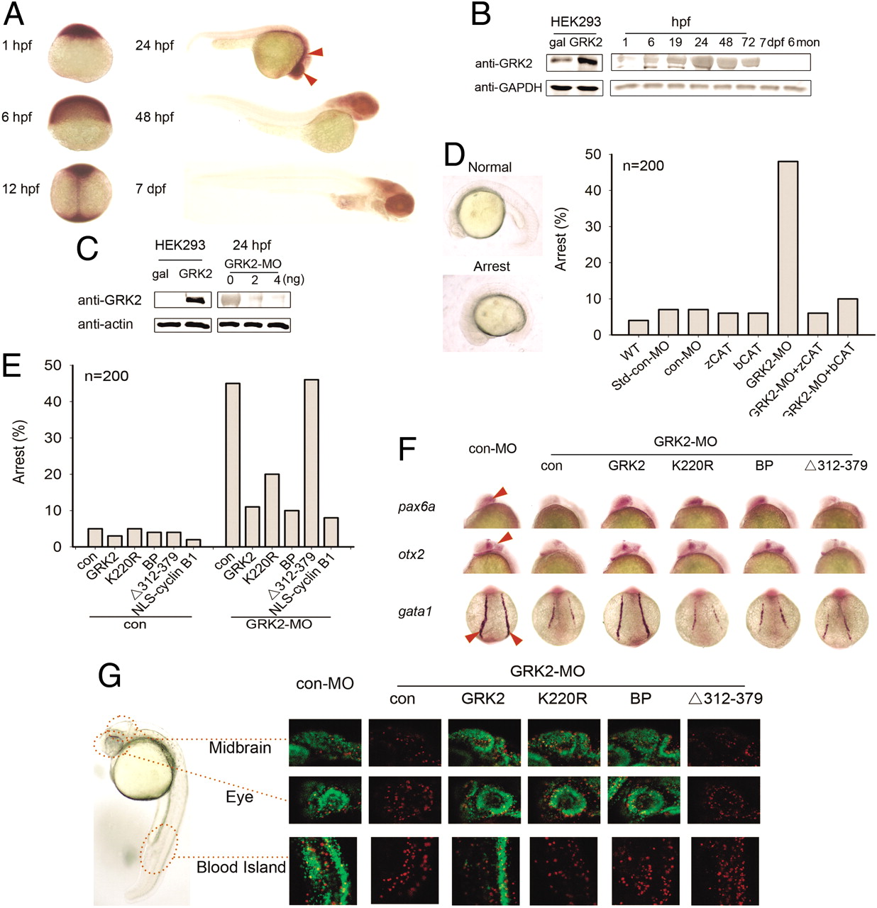 Dysregulation of PTCH1-cyclin B1 pathway is involved in early arrest of GRK2 knockdown embryos. (A) Expression pattern of GRK2 during zebrafish developmental process by using whole-mount in situ hybridization (WISH) with a zebrafish GRK2-specific antisense riboprobe on embryos at the indicated stages. Areas with high intensity hybridization signal are indicated by arrows. (B) Expression levels of GRK2 during early developmental stages. Zebrafish embryos (15–20) were collected at each time point, and lysates were analyzed in Western blots by using rabbit anti-GRK2 antibody (Santa Cruz). Lysates from HEK293 cells transfected with beta-galactosidase (gal) or bovine GRK2 expression plasmids were taken as controls. GAPDH was used as a loading control (hpf, hours postfertilization; dpf, days postfertilization). (C) Effect of GRK2-MOs on GRK expression levels. Zebrafish embryos were injected at the 1- or 2-cell stage with 2- or 4-ng GRK2 splicing morpholino (GRK2-MO). GRK2 levels in embryo lysates were examined by Western blot analysis. (D) Somite stage arrest in GRK2 morphants, could be rescued by both zebrafish and bovine GRK2 catalytic domain. Each embryo was injected at the 1- or 2-cell stage with 2-ng con-MO, or 2-ng GRK2-MO alone, or with 0.15ng zebrafish or bovine GRK2 catalytic domain mRNA. Embryos were categorized, counted, and photographed 19 hpf. The percentages of arrest embryos are shown (200 embryos were counted for each bar). (E) GRK2, K220R, BP, or NLS-cyclin B1 rescues the arrest phenotype of GRK2 knockdown embryos. (F) GRK2, K220R, BP, or NLS-cyclin B1 rescues the deficiency in zebrafish eye and midbrain development. WISH was performed on 15–20 somite stage embryos injected with GRK2-MO and mRNA of indicated constructs, using pax6a, otx2 and gata1 riboprobes. Images of pax6a and otx2 were taken from a lateral view and those of gata1 from a dorsal view. (G) Effects of GRK2 on cell cycle progression in eye, midbrain, and hematopietic system were examined using p-H3 and BrdU assays. Twenty-four hpf injected embryos were collected and stained for p-H3 and BrdU. The images were taken from a lateral viewpoint, showing the eye, the midbrain, and the blood island.