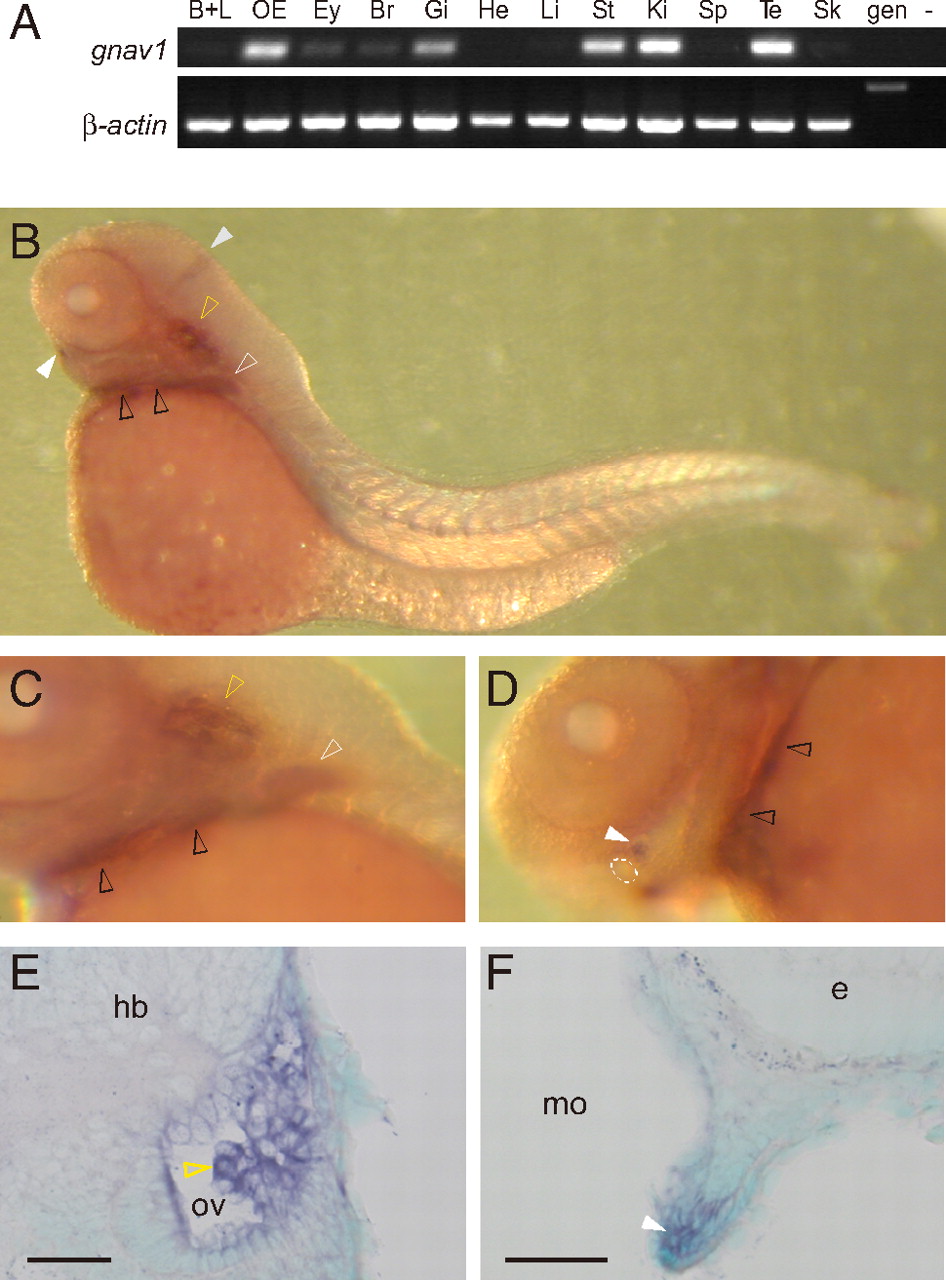Expression pattern of the zebrafish gnav1 gene. (A) Transcripts for zebrafish gnav1 were detected by RT-PCR using intron-spanning primer pairs. β-Actin was used as a positive control. B+L, barbels and lips; OE, olfactory epithelium; Ey, eye; Br, brain; Gi, gill; He, heart; Li, liver; St, stomach; Ki, kidney; Sp, spleen; Te, testis; Sk, skin; gen, genomic DNA; -, negative control without template DNA. (B–F) Whole-mount in situ hybridization with gnav1 probe. (B and C) Lateral views of the whole larva and posterior part of the head region, respectively. (D) Ventral view of the head region. Dotted circle, mouth. (E and F) Cross-sections after hybridization show expression in the developing inner ear (E) and lower lip (F). Sections were counterstained with methyl green. Dorsal is to the top. White and gray solid arrowheads indicate the cell clusters next to the lower lip and the midbrain–hindbrain boundary, respectively. White, yellow, and black open arrowheads point to labeled cells within pectoral fins, otic vesicle (ov), and branchial arches, respectively. e, eye; hb, hindbrain; mo, mouth cavity. (Scale bars: 50 μm.)