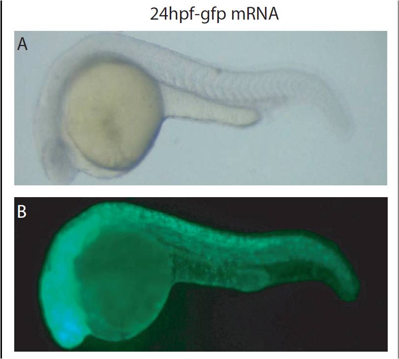 Fig. S1 In vivo translation of 1 ng gfp mRNA. (A) bright field image showing no developmental abnormalities and (B) widespread appearance of gfp signal within the developing embryo at 27 hpf.