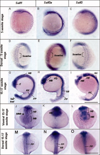 Fig. 4 Expression of heparan sulfate (HS) sulf genes during early zebrafish development. Expression of sulf1 at 5-somite stage, lateral view (A) and dorsal view (D) and 15–17-somite stage, lateral (G), ventral (J), and dorsal views (M). Expression of sulf2a at 5-somite stage, lateral view (B) and dorsal view (E), and 15–17-somite stage, lateral (H), ventral (K), and dorsal view (N), Expression of sulf2 at 5-somite stage, lateral view (C) and dorsal view (F), and 15–17-somite stage, lateral (I), ventral (L), and dorsal view (O). AV, axial vessels; E, eye; FP, floorplate; HB, hindbrain; HC, hypochord; MB, midbrain; PD, pronephric ducts; SB, somite boundaries. SC, spinal cord. Scale bar = 200 μm.