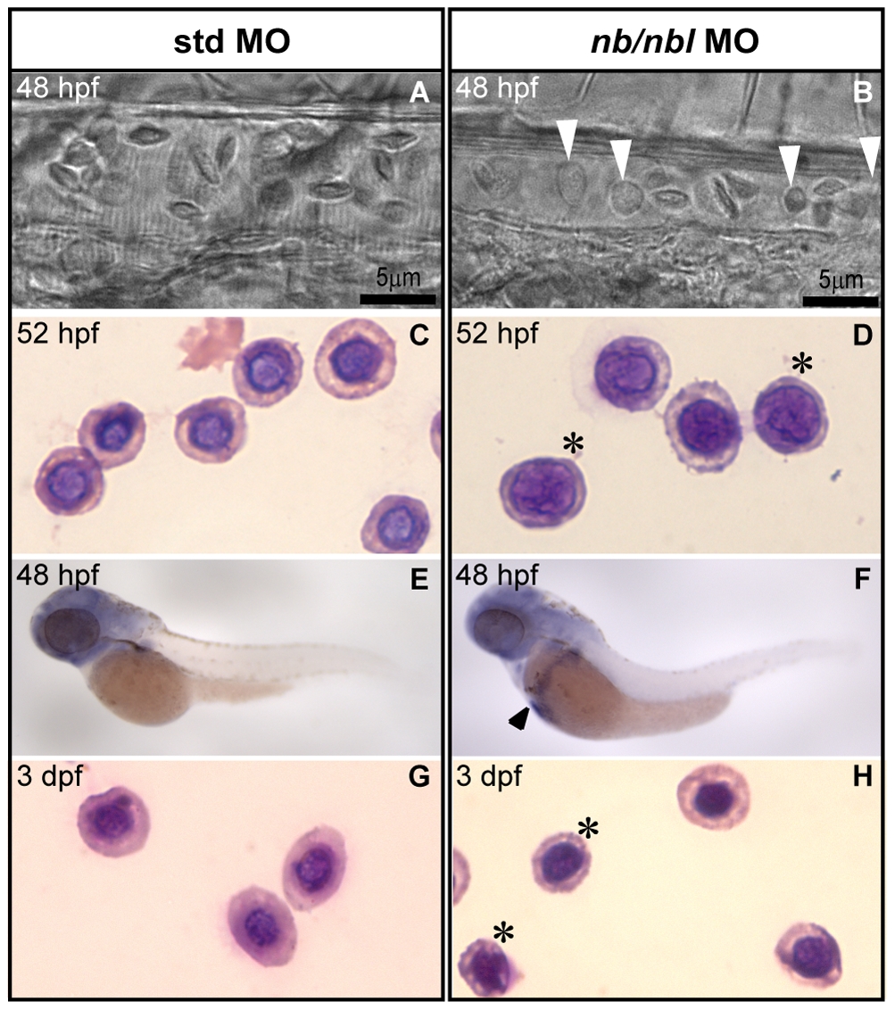 A–B. Bright-field microscopy of blood cells in the caudal arteries of living 48 hpf std MO embryos (A) and nb/nbl morphants (B). nb/nbl MO-injected embryos with no apparent hematopoietic defects show the presence of abnormal-shaped blood cells (white arrowheads) in the blood flow (B). C–D, G–H. Wright-Giemsa staining of circulating embryonic red blood cells from controls and nb/nbl morphants at 52 hpf (C, D) and 3 dpf (G, H). Erythroid cells of apparently unaffected nb/nbl MO injected embryos were larger, showed a large nucleus and had more basophilic cytoplasm indicating the presence of maturation defects (D, H). Asterisks indicate representative erythroid cells with maturation defects. E–F. WISH using gata1 on 48 hpf std MO (E) and nb/nbl MO-injected embryos (F). gata1 expression persists in red blood cells of nb/nbl morphants revealing the presence of immature red cells (black arrowhead).