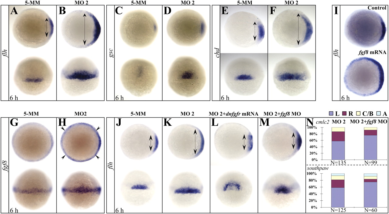 Fig. 4 Setdb2 restricts dorsal organizer formation and regulates left–right asymmetry through suppressing Fgf8 activity. (A–F) WISH analyses of organizer markers flh (A and B), gsc (C and D), and chd (E and F) in the 5-MM control and setdb2 MO2-injected embryos at 6 hpf. Double-headed arrows denote territories of dorsal organizer. Embryos are animal views in the Upper panels, dorsal views in the Bottom panels. (G–I) WISH analyses of fgf8 expression (G and H) in the 5-MM control and setdb2 MO2-injected embryos at 6 hpf and effects of fgf8 overexpression on the dorsal organizer development as revealed by flh expression (I). Embryos are animal views in panels G and H (Upper) and I and dorsal views in panels G and H (Bottom). (J–M) WISH analyses of flh in the 6-hpf embryos injected with 5-MM control (J), setdb2 MO2 (K), setdb2 MO2 plus dominant-negative fibroblast growth factor receptor (dnfgfr) mRNAs (L), and setdb2 MO2 plus fgf8 morpholino oligonucleotides (M). (N) Statistic analyses of heart laterality marker cmlc2 and asymmetric gene southpaw in 6-hpf embryos injected with setdb2 MO2 and setdb2 MO2 plus fgf8 morpholino. Embryos are animal views in the Upper Panels and dorsal views in the Lower Panels.