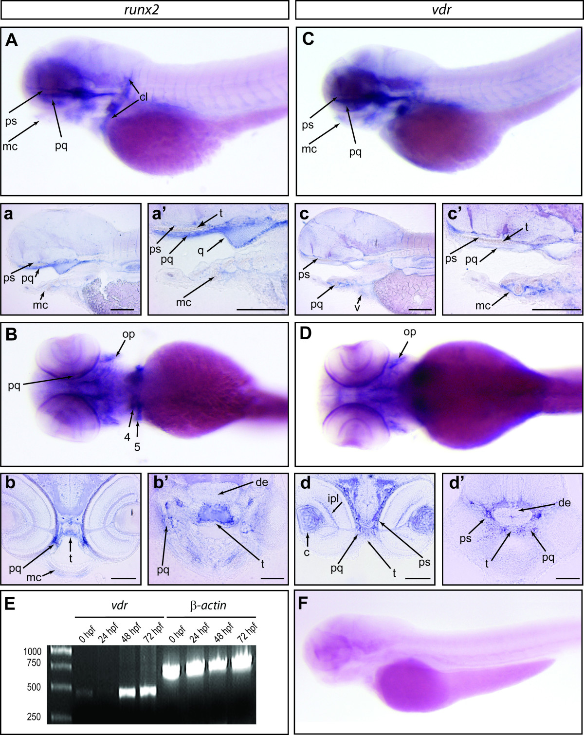 Fig. 2 Expression pattern of Runx2b and VDR in Danio rerio. An in situ hybridization of a 72 hpf zebrafish embryo hybridized with a Runx2b antisense probe is shown in a lateral (A) and ventral (B) view. The images in a and a′ are sagittal sections of the specimen shown in A. The images in b and b′ are transversal sections of the specimen shown in B. An in situhybridization of a 72 hpf zebrafish embryo hybridized with a VDR antisense probe is shown in a lateral (C) and ventral (D) view. The images in c and c′ are sagittal sections of the specimen shown in C. The images in d and d′ are transversal sections of the specimen shown in D. (E) RT-PCR performed on cDNA from zebrafish embryos at 0, 24 hpf, 48 hpf and larvae at 72 hpf with primers specific for VDR and β-actin. The molecular weight standard is shown on the left. (F) Lateral view of a 72 hpf zebrafish larvae hybridized with a VDR sense probe. Abbreviations: c, crystalline; cl, cleithrum; de, diencephalon; ipl, inner plexiform layer; mc, meckel cartilage; op, operculum; pq, palate quadrate; ps, parasphenoid; q, quadrate; t, trabecula; v, ventricle; 4 and 5, the IV and V branchial cartilage territories, respectively. The scale bar in a, a′, b, b′, c, c′, d and d′ represents 50 micrometers.