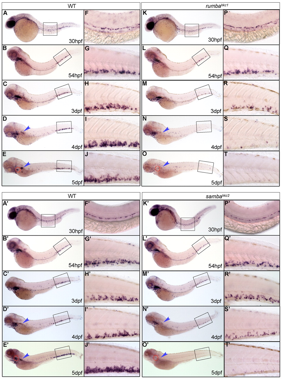 Fig. 2 Definitive HSPCs are not sustained in the CHT of rumbahkz1 and sambahkz2 mutants. (A-T&strong;) WISH of c-myb in 30 hpf, 54 hpf, 3 dpf, 4 dpf and 5 dpf wild-type (WT) zebrafish siblings (A-E&strong;) and rumbahkz1-/- (K-O), and sambahkz2-/- mutants (K′-O′). The right-hand columns (F-J′,P-T′) represent the 20x magnification of the boxed regions in the left-hand columns (A-E′,K-O′). The red circles and the blue arrowheads show the position of the thymus and kidney, respectively.