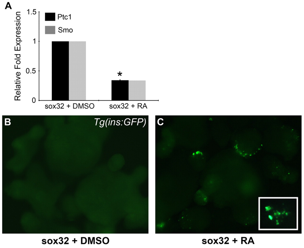 Fig. 5 RA downregulates the Hh receptor ptc1 in endodermal explants. (A) qPCR of ptc1 and smo expression levels in RA-treated zebrafish endodermal explants (mean ± s.e.m.). Asterisk indicates a significant change (at least 2 s.d.) compared with control. (B,C) Tg(ins:GFP) endodermal explants treated with DMSO (B) or 1 μM RA (C). To create the endoderm explants, sox32 mRNA was injected into Tg(ins:GFP) embryos at the 1-cell stage (see text).