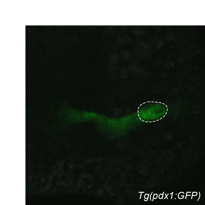 Fig. S1 Transgenic (pdx1:GFP). Confocal image of Tg(pdx1:GFP) expression at 28 hpf. Dorsal view, anterior to the left. Dashed line outlines the primary islet.