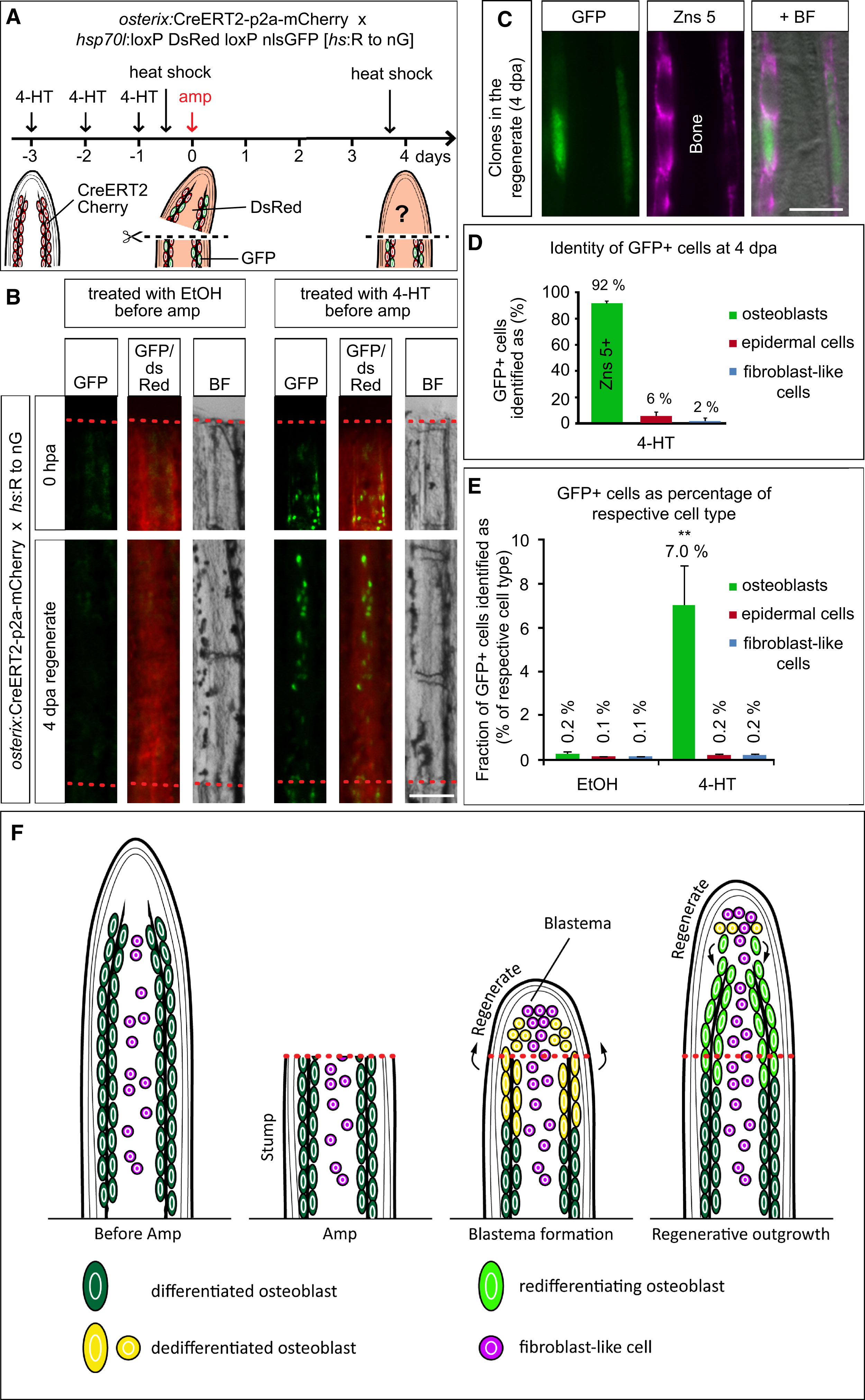 (E) Distribution of GFP+ cells in osterix:CreERT2-p2a-mCherry; hs:R to nG double-transgenic fins at 4 dpa. Of all cells in the regenerate, 0.4% are GFP+ in EtOH-treated fish versus 7.4% in 4-HT-treated fins. The fraction of GFP+ epidermal cells and fibroblast-like cells does not significantly differ between EtOH and 4-HT-treated fins, whereas 35-fold more GFP+ osteoblasts are found in 4-HT fins. Student′s t test, **p = 0.005 (nEtOH = 5 fish, 10 rays, 55 sections with 79 GFP+ cells; n4-HT = 5 fish, 10 rays, 61 sections with 1155 GFP+ cells).
