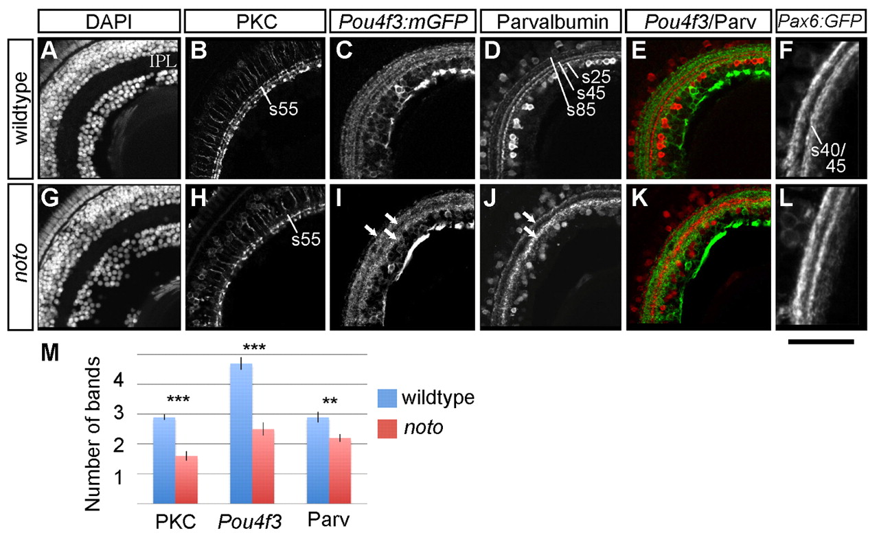 Fine neurite targeting is disrupted in the 5 dpf noto mutant inner plexiform layer (IPL). (A-L) Representative sections of wild-type (A-F) and mutant (G-L) zebrafish retina. DAPI nuclear stain shows the cellular organization of the retina, including location and width of the IPL (A,G). Protein kinase C (PKC)+ bipolar cells (BCs) project terminals to three IPL sublaminae in wild type (B); in the mutant, outermost sublamina s55 is sparsely innervated (H). Pou4f3:mGFP+ ganglion cell (GC) dendrites innervate five sublaminae in wild type (C); arrows in I show three coarse sublaminae in the mutant IPL (I). Parvalbumin (Parv)+ amacrine cells of the inner nuclear layer (INL) and ganglion cell layer (GCL) project neurites to three sublaminae (s25, s45 and s85) in wild type (D); arrows in J show two broad sublaminae in the mutant (J). Merged images show the relative positions of Pou4f3:mGFP+ and Parv+ IPL sublaminae (E,K). Pax6:mGFP+ amacrine cells project neurites to two IPL bands; the inner band is actually the two fine sublaminae s40 and s45 (F,L). The s40/s45 division is lost in the mutant. Scale bar: 50 µm for A-E,G-K; 30 μm for F,L. (M) Mean number of distinct bands of PKC, Pou4f3:mGFP and Parv immunoreactivity from ten wild-type (blue) and ten mutant (red) retinas. Error bars represent s.e.m. **P<0.01; ***P<0.00001.