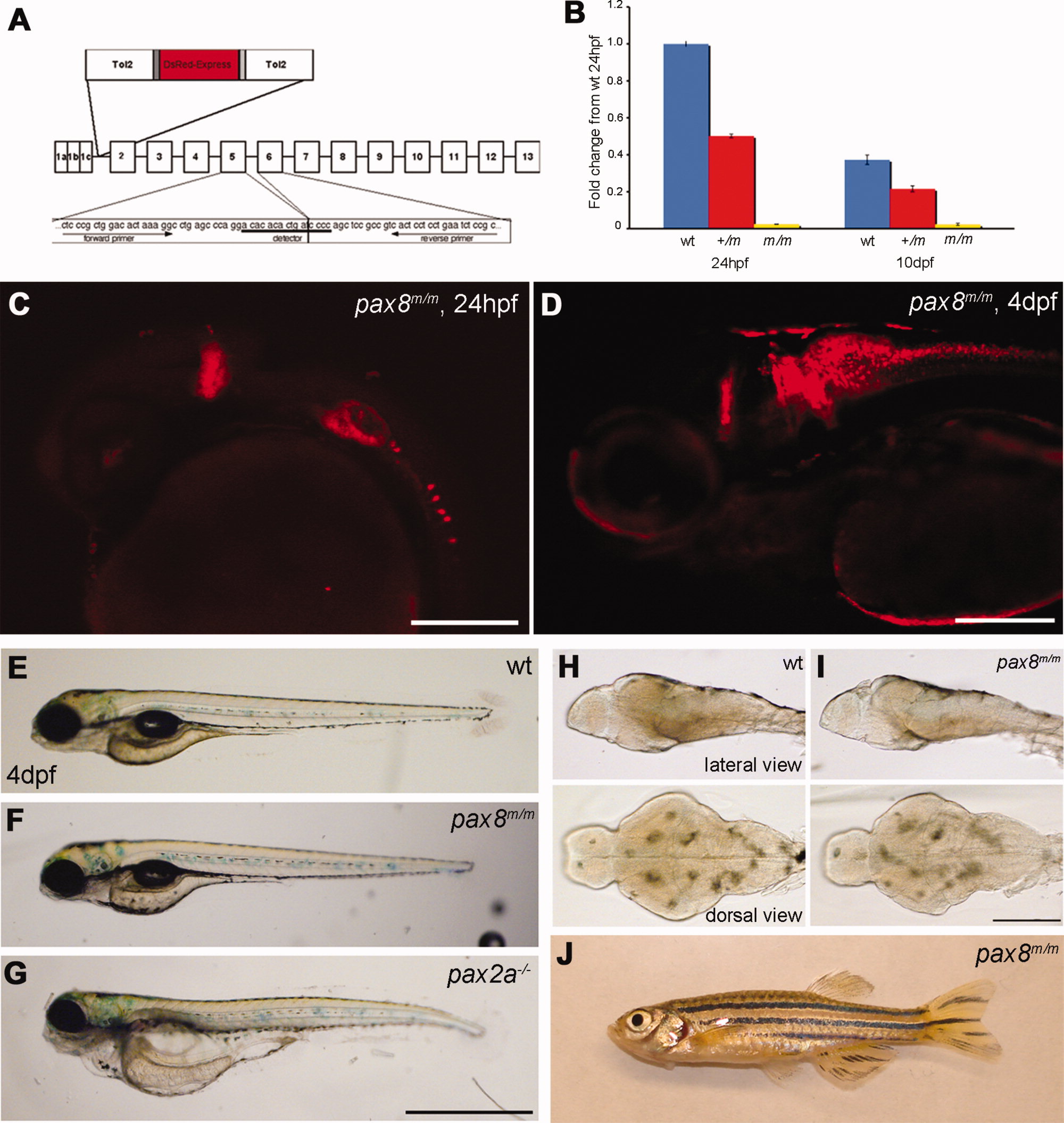 Homozygous embryos are Pax8 hypomorphs. A: The exon composition of zebrafish pax8 indicating the insertion site of Tol2. Primers for the qPCR were designed so that the amplicon spans the junction between exon 5 and exon 6. B: qPCR of the pax8 transcript in wild-type (wt), pax8+/m, and pax8m/m fish at 1 dpf and 10 dpf. Wild type at 1 dpf was used as a reference sample to obtain relative transcript amounts. Error bars represent the SEM of the average from triplicates of a single run (n = 3). C,D: Confocal images of RFP signals in pax8m/m fish at 24 hpf (C) and 4 dpf (D). E–G: The gross morphology of larva at 4 dpf. E is wild type, F is pax8m/m, and G is pax2a–/–. The pax2a–/– larva is deformed and dies at 7–10 dpf. H,I: The brain morphology is normal in the pax8m/m larva (I) compared with the WT larva (H). Top is the lateral view and bottom is the dorsal view. J: Adult pax8m/m fish. Scale bars = 200 μm in C,D; 1 mm in G (applies to E–G; 500 μm in I (applies to H,I).