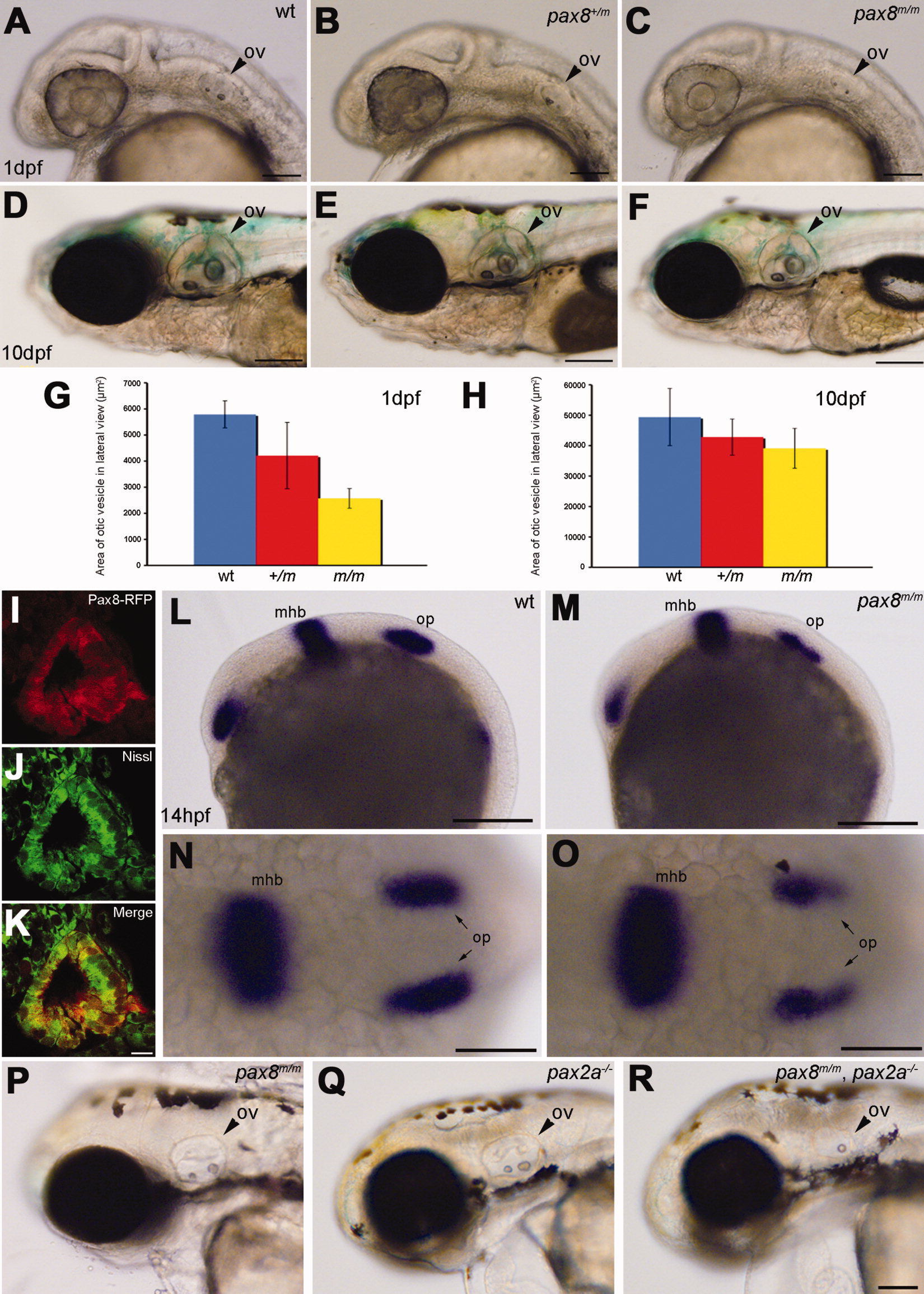 Otic vesicle formation defects in pax2a/pax8 mutants. A–F: The otic vesicle (ov) size is slightly reduced in pax8m/m fish. Lateral view of the head region at 1 dpf (A–C) and 10 dpf (D–F). A and D are the wild type (wt), B and E are pax8+/m, and C and F are pax8m/m. G,H: The area of the otic vesicle as measured in the lateral view at 1 dpf (G) and 10 dpf (H). Wild-type (blue), pax8+/m (red), and pax8m/m fish (yellow). The average and the standard deviation are shown (n = 6 each). I–K: RFP+ cells (I) line the cavity of the otic vesicle, as visualized by the Nissle counterstain (J) at 1dpf. The merged picture is shown in K. L–O: In situ hybridization with pax2a probes in wild-type (L,N) and pax8m/m embryos (M,O) at 14 hpf. Pax2a expression is detected in retina, mhb, and otic placode (op) in wild type. Note the signal in the otic placode is weaker in pax8m/m embryo. The difference is more obvious in the higher magnification of the dorsal view (N,O). P,Q,R: The reduction of the otic vesicle size is more pronounced in the pax2a/pax8 double mutant. The lateral view of the head is shown for pax8m/m (P), pax2a–/– (Q), and pax2a/pax8 double-mutant embryos at 2 dpf (R). Magenta-green images for I–K are provided in Supporting Information Figure 2. Scale bars = 100 μm for A–C; 200 μm in F (applies to D–F); 10 μm in K (applies to I–K); 200 μm in L,M; 100 μm in N,O; 100 μm in R (applies to P–R).