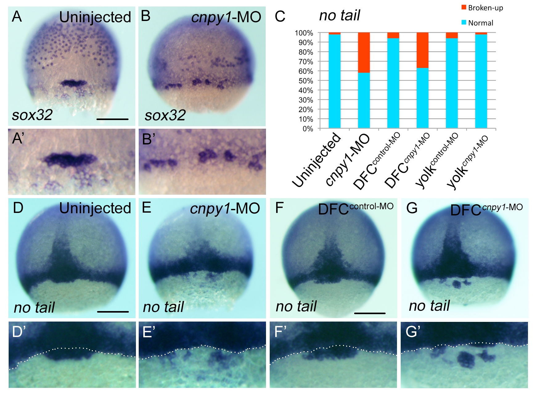 cnpy1 function is essential for DFC clustering. (A, B) sox32 expression in uninjected (A) or cnpy1-MO-injected (B) embryos. Scale bar: 200 μm. (C) Percentages of normal or broken-up DFCs were scored using the no tail expression pattern in uninjected (n = 84), cnpy1-MO (n = 55), DFCcontrol-MO (n = 64), DFCcnpy1-MO (n = 48), yolkcontrol-MO (n = 50) or yolkcnpy1-MO (n = 66) embryos. Statistically significant (P < 0.05) differences could be seen in uninjected versus cnpy1-MO (P = 2.76 x 10-9) and DFCcontrol-MO versus DFCcnpy1-MO (P = 6.1 x 10-5), while no difference was seen in uninjected versus DFCcontrol-MO (P = 0.403), uninjected versus yolkcontrol-MO (P = 0.361), DFCcontrol-MO versus yolkcontrol-MO (P = 1.000) or yolkcontrol-MO versus yolkcnpy1-MO (P = 0.314). (D-G) no tail expression in uninjected (D), cnpy1-MO-injected (E), DFCcontrol-MO (F) or DFCcnpy1-MO (G) embryos. Dorsal view, anterior to the top. Scale bar: 200 μm. (A′-D′) Higher-magnification images highlight DFCs. The white dotted lines mark the boundary between DFCs and the blastoderm margin.