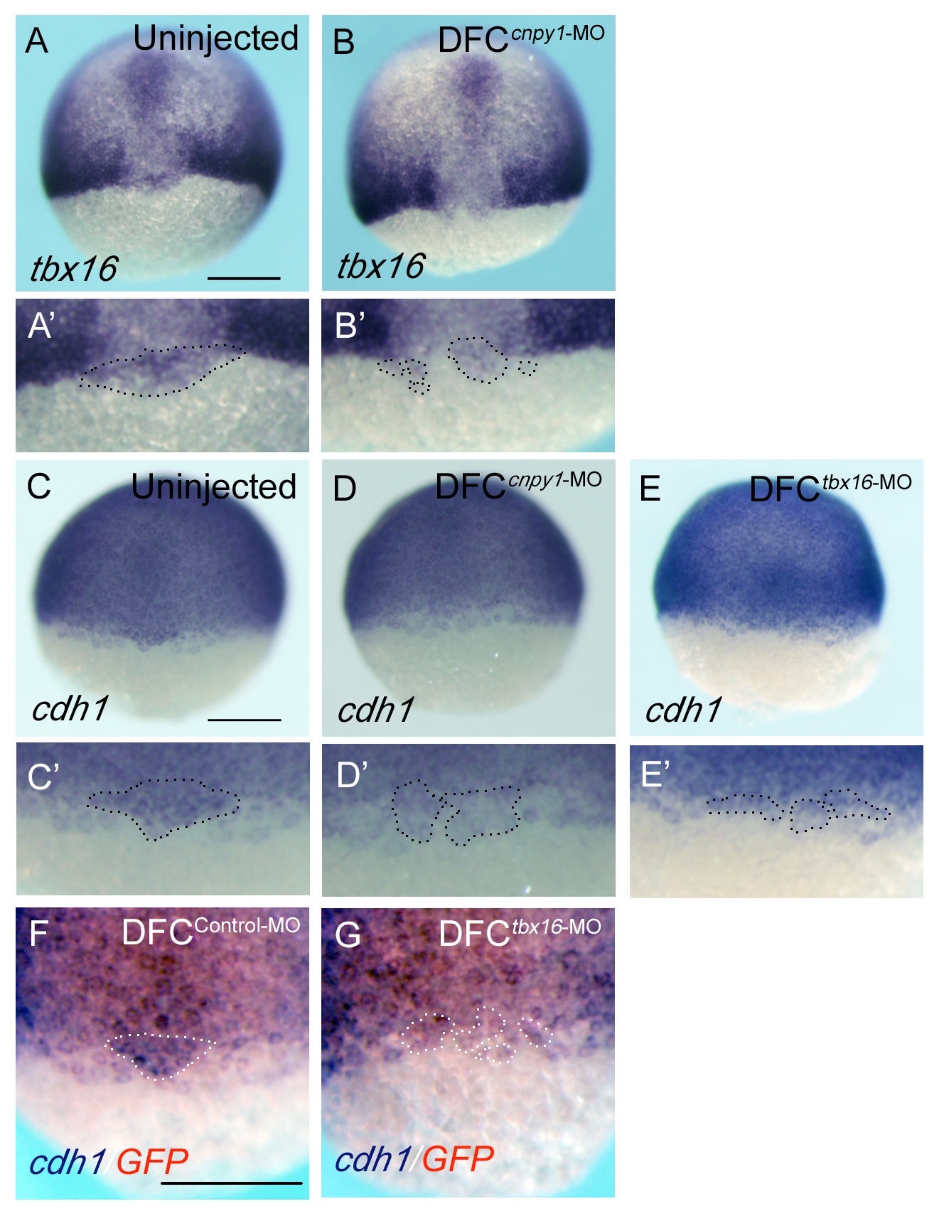 A genetic cascade including tbx16 and cdh1 mediates FGF signaling in DFCs. (A, B) Dorsal view of tbx16 expression in uninjected (A) or DFCcnpy1-MO (B) embryos at 65% epiboly stage. Scale bar: 200 μm. (C-E) Dorsal view of cdh1 expression in uninjected (C), DFCcnpy1-MO-injected (D) or DFCtbx16-MO-injected (E) embryos at 65% epiboly stage. Scale bar: 200 μm. (A′-E′) Higher-magnification images highlight DFCs. (F, G) cdh1 (purple) and GFP (red) expression in DFCcontrol-MO-injected (F) or DFCtbx16-MO-injected (G) Tg[sox17:GFP] embryos at 60% epiboly stage. Scale bar: 200 μm. Dotted lines in panels A′-E′, F and G mark the outlines of the DFC populations.