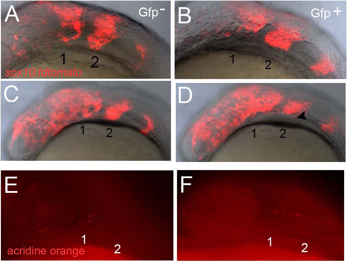 Loss of BMP signaling during arch formation does not disrupt NC migration or survival. (A-D) Live images of fluorescently labeled NC cells in Tg(sox10:tdTomato) transgenics, lateral views, anterior towards the left. Migratory streams of NC in the mandibular (1) and hyoid (2) arches appear identical in GFP- and GFP+ embryos. (E,F) Acridine Orange staining of apoptotic cells, lateral views, anterior towards the left, also reveals no difference in numbers of labeled cells in arches 1 and 2 between heat shocked hs-dnBmpr1a embryos and controls.