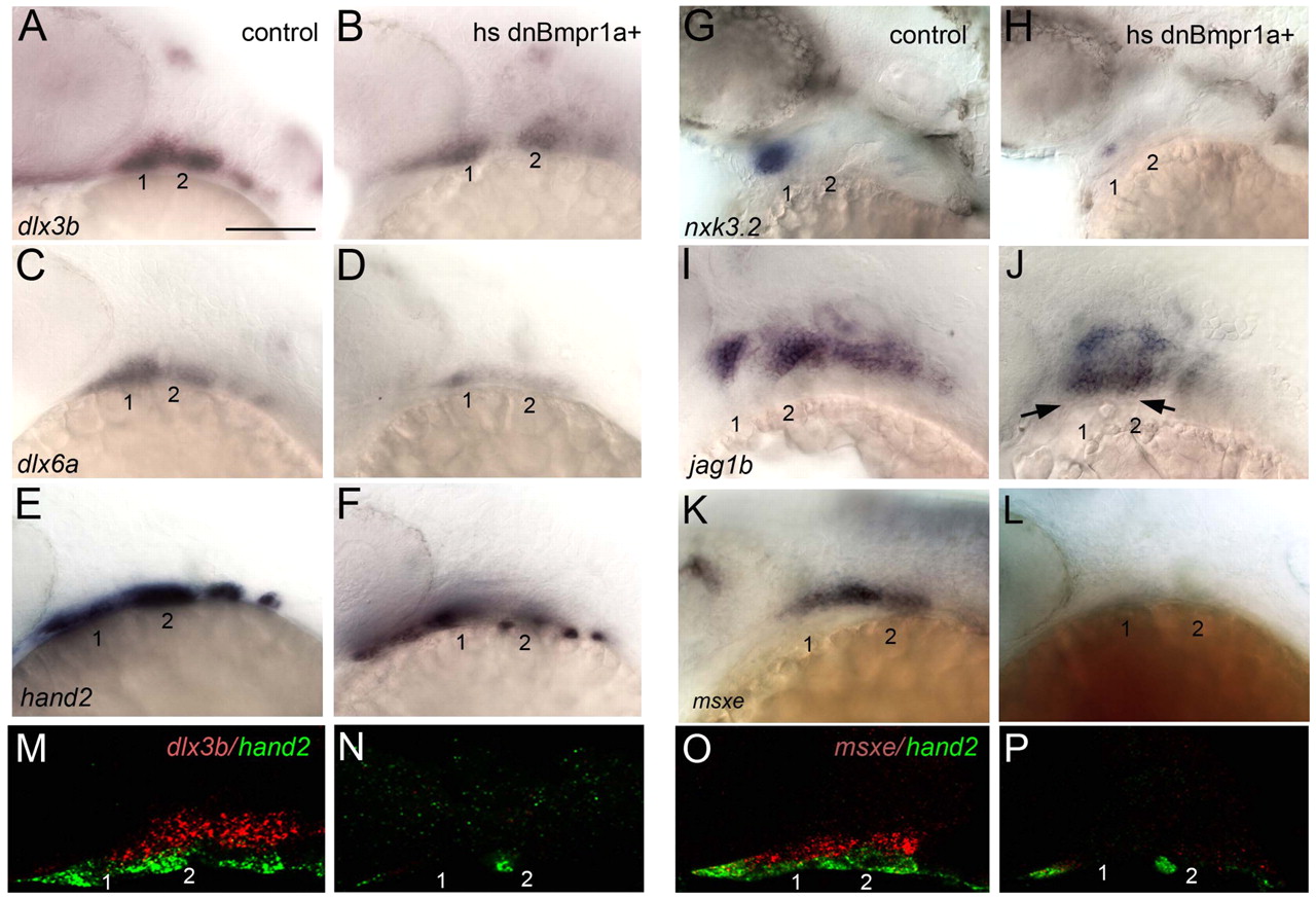 BMP signaling is required for ventral cell specification in the arches. (A-P) Whole-mount in situ hybridization to detect expression of genes involved in DV arch patterning, lateral views, anterior towards the left in controls (A,C,E,G,I,K,M,O) and Tg(hsp70I:dnBmpra1-GFP) transgenics heat shocked at 16-18 hpf (B,D,F,H,J,L,N,P). dlx3b (A,B), dlx6a (C,D) and hand2 (E,F) expression is reduced at 28 hpf. nkx3.2 (G,H) expression is reduced and jag1b expression (I,J) expands ventrally at 36 hpf (arrows). msxe expression is lost at 30 hpf (K,L). Arches 1 and 2 are numbered. (M-P) Two-color fluorescent in situs to detect dlx3b (M,N, red) or msxe (O,P, red) simultaneously with hand2 (green). Scale bar: 100 μm.