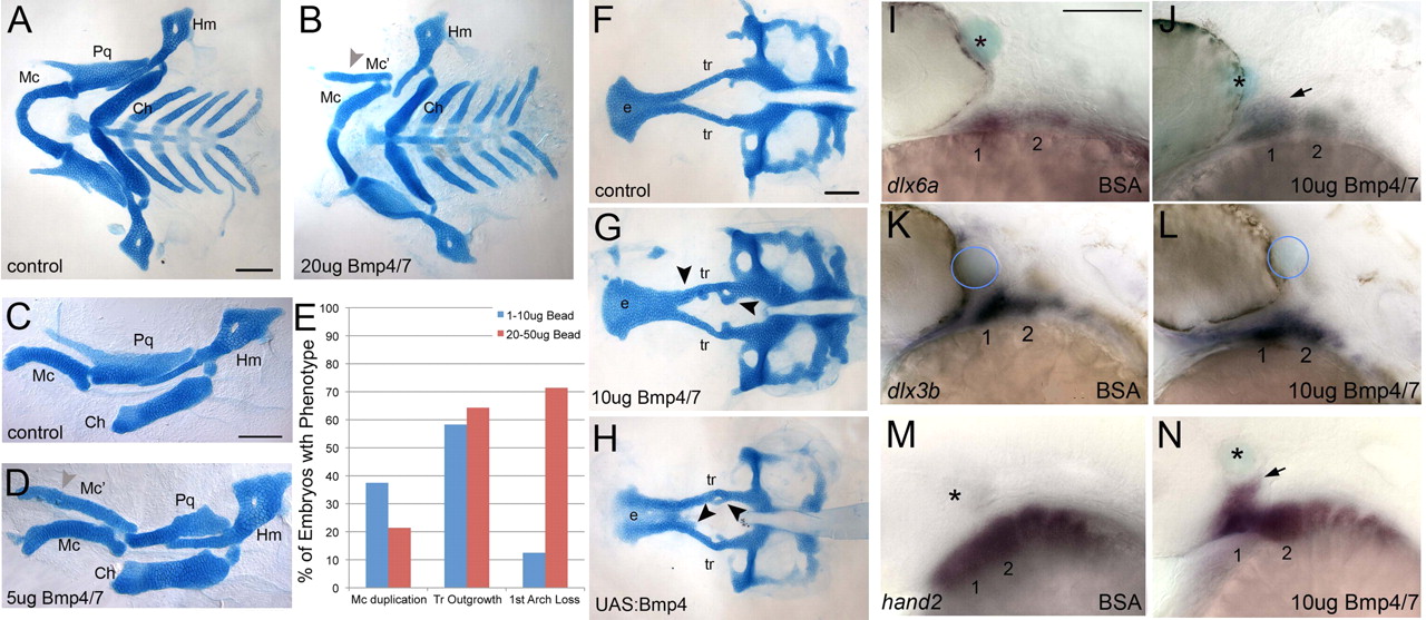 Exogenous BMP is sufficient to induce ventral arch identity. (A-D,F-H) Alcian Blue-stained cartilages of 4-5 dpf larvae, dissected and flat-mounted, anterior towards the left. (I-N) Whole-mount in situ hybridization at 30 hpf, lateral views, anterior towards the left. (A,B) Pharyngeal cartilages of a control (A) and an embryo implanted behind the eye at 20 hpf with a bead soaked in 20 μg/μl of human recombinant BMP4/7 heterodimers (B). (C,D) Isolated cartilages of the mandibular (1) and hyoid (2) arches: control (C); BMP4/7 bead-implanted (D). Grey arrowheads in B,D indicate duplicated Mc cartilages. (E) Histogram of phenotype frequency in bead-implanted embryos depending on BMP4/7 concentration. (F-H) Neurocranial cartilages: control (F); BMP4/7 bead-implanted (G); heat-shocked Tg(hsp70I:Gal4;UAS:Bmp4) (H). Black arrowheads indicate ectopic cartilages. (I,J) dlx6a expression slightly expands dorsally (arrow) in response to a BMP4/7-soaked bead (J). (K,L) dlx3b expression does not change when BMP4/7-soaked beads are implanted. (M,N) hand2 expression also expands dorsally (arrow) in response to BMP4/7 protein. Asterisks and blue circles indicate beads. 1, mandibular arch; 2, hyoid arch; Ch, ceratohyal; e, ethmoid plate; Hm, hyomandibular; Mc, Meckel’s cartilage; Mc’, ectopic Meckel’s cartilage; Pq, palatoquadrate; tr, trabeculae. Scale bars: 100 μm.