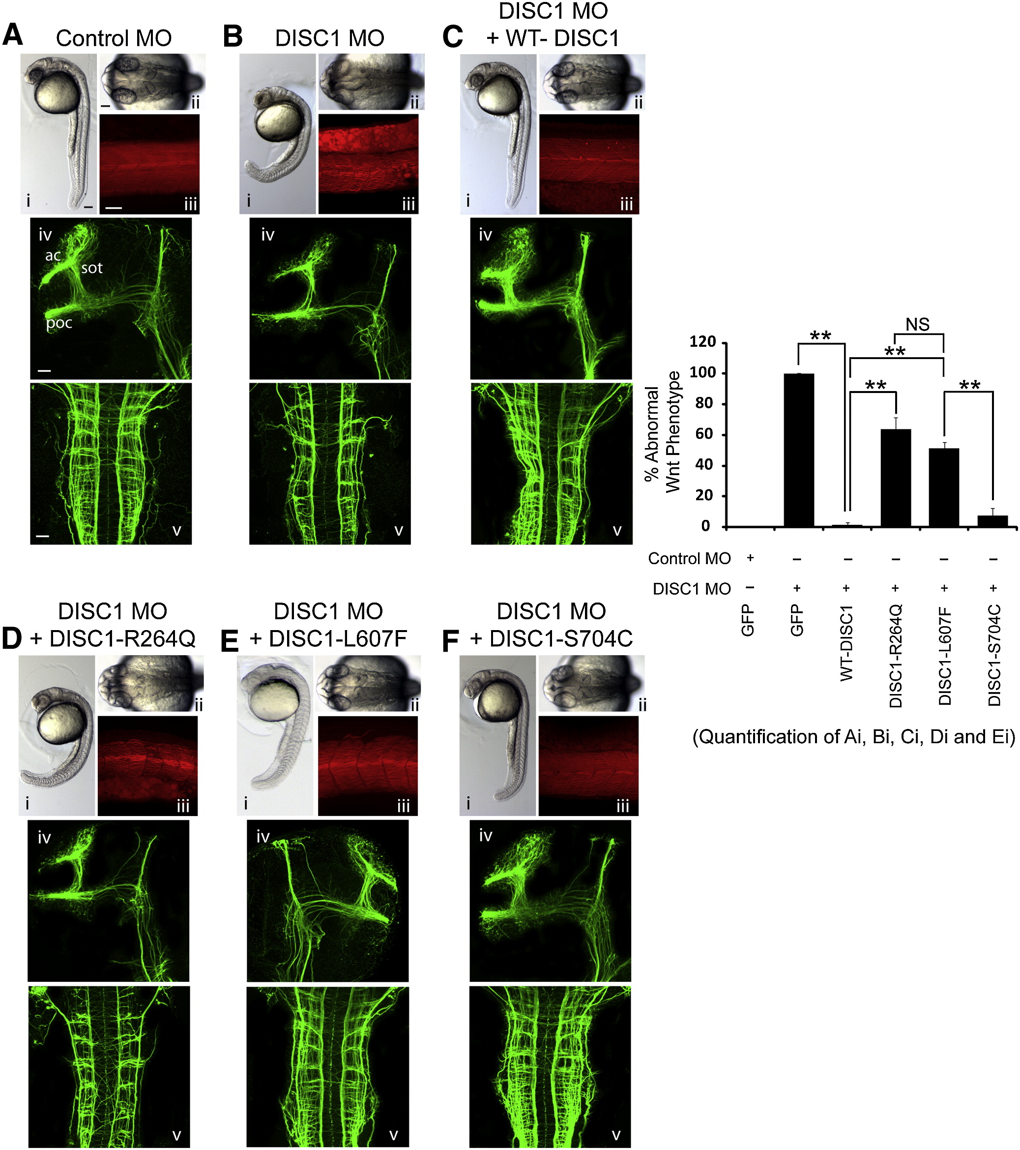 ac, anterior commissure; poc, postoptic commissure; sot, supraoptic tract. z, Quantification of the percentage of embryos displaying a curved tail in each condition that is similar to DISC1-dependent Wnt signaling. **p < 0.005, ns = not significant. Error bars represent mean ± SEM. All scale bars represent 50μm.