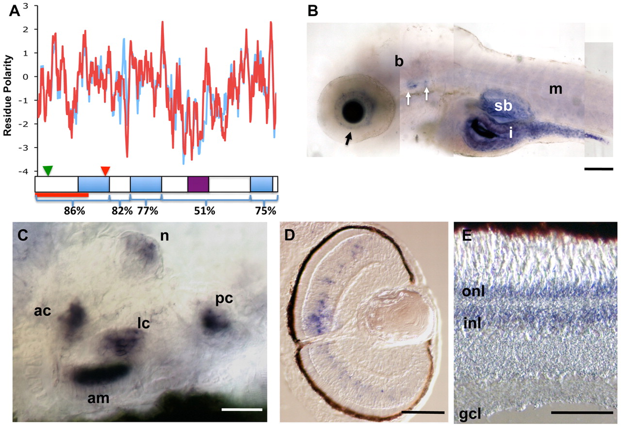 Fig. 1 Zebrafish ush1c is expressed in retina and the inner ear. (A) The predominant splice form of ush1c corresponds to mammalian isoform A, with 21 exons that produce a 1.6 kb mRNA. A hydrophobicity plot of zebrafish (red) and human (blue) isoform A protein sequence shows conserved residue polarity. % amino acid identity with human protein is indicated below the plot. The positions of the ush1cfh293 nonsense mutation (red arrowhead), the MO target (green arrowhead) and the region recognized by the zebrafish harmonin antibody (red bar) are indicated. (B) At 5 dpf, ush1c transcripts are abundant in the inner retina (black arrow), the sensory patches of the ear (white arrows), the intestinal tract (i) and the swim bladder (sb). Fainter expression in the brain (b) and trunk muscles (m) is also observed. (C) High-magnification view of a 5 dpf whole-mount zebrafish ear showing ush1c expression in all sensory patches (ac, lc, pc: anterior, lateral and posterior cristae, respectively; am: anterior macula) and an adjacent head neuromast (n). (D) ush1c transcripts are restricted to cells in the inner nuclear layer in 5 dpf sectioned retina. (E) Central section of an adult zebrafish retina showing continued strong expression in the inner retina; expression is detected in the outer nuclear layer as well. onl, outer nuclear layer; inl, inner nuclear layer; gcl, ganglion cell layer. Scale bars: 100 μm (B); 20 μm (C); 50 μm (D,E).