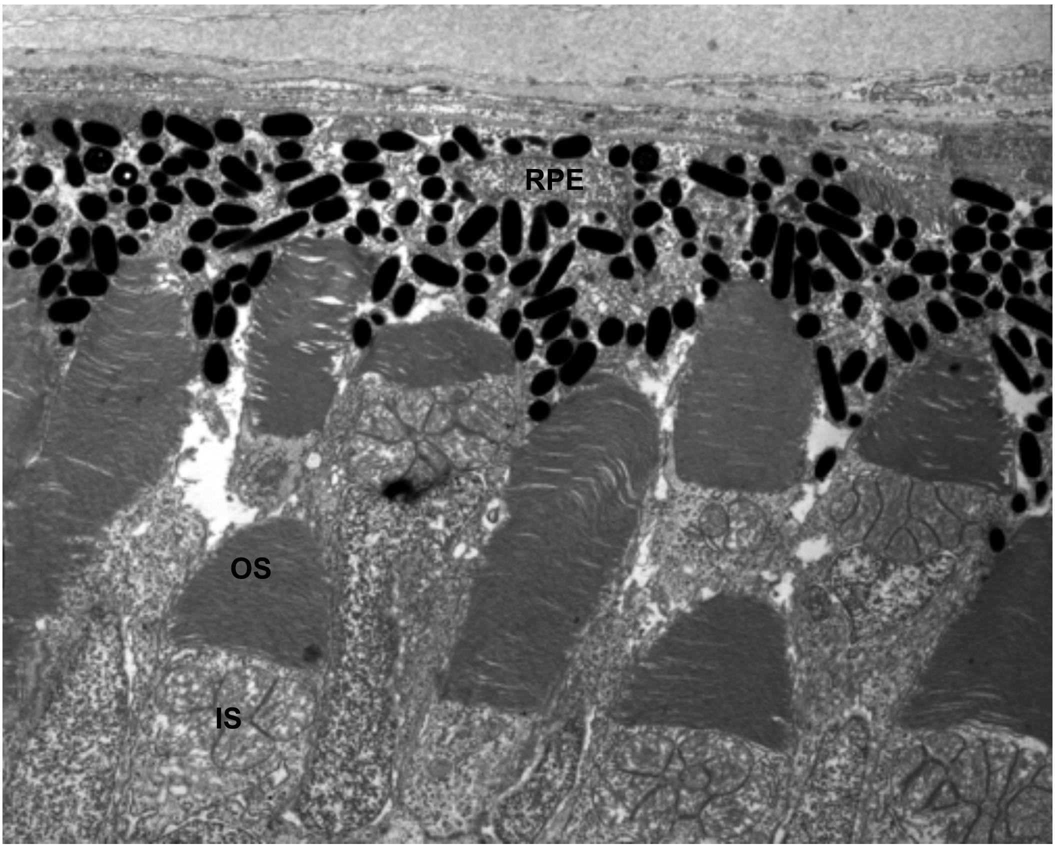 Fig. S3 Organization of outer segment disk membranes appears normal in 6dpf ush1cMO larvae. A Transmission electron micrograph showing photoreceptor outer segment ultrastructure in morphant larvae. RPE: Retinal Pigmented Epithelium; OS: Outer Segment; IS: Inner segment. Scale bar: 1μm.