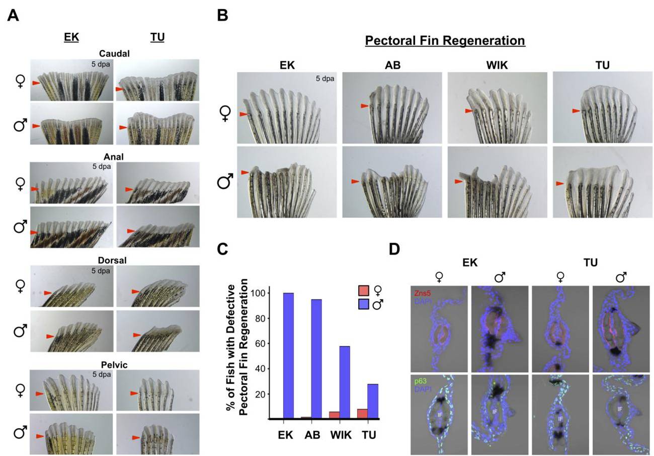 (A) Both sexes in the EK and TU strains efficiently regenerated their caudal, anal, dorsal, and pelvic fins.
