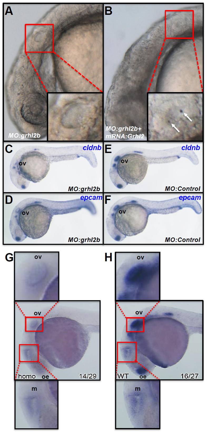 Fig. S3 Otic vesicle defects following loss of grhl2b and persistence of grhl2b in mutant midbrain. (A,B) Loss of otoliths is visible in grhl2b morphants; these can be rescued by re-injection with Grhl2 mRNA (arrows; B). (C-F) Fish injected with the grhl2b-ATG MO show loss of otic cldnb (C) and epcam (D) expression, relative to controls (E,F). (G,H) Although expression in the olfactory epithelium (oe) and otic vesicle (ov) is greatly reduced in homozygous-null grhl2b mutants (homo; G), expression of grhl2b in the midbrain (m) is only slightly reduced compared with wild-type fish (WT; H).