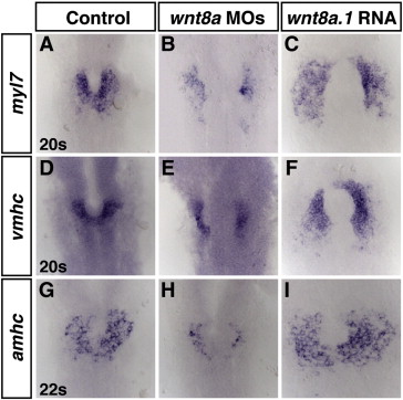 Zebrafish Wnt8a paralogs are required to promote proper CM formation. (A,D,G) Control uninjected embryos. (B,E,H) Embryos depleted of wnt8a.1 and wnt8a.2 display a reduced mount of cells expressing myl7, vmhc and amhc. (C,F,I) Embryos injected with wnt8a.1 mRNA display increased numbers of cells expressing myl7, vmhc and amhc.