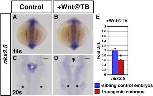 Increased Wnt signaling at the TB stage causes a loss of nkx2.5 expression after the 14 somite stage. (A,C) HCSEs. (B,D) GFP + sibling embryos. Expression of nkx2.5 is normal in embryos at the 14 s stage after increasing Wnt signaling at the TB stage (B; 100%, n = 27), compared to HCSEs (A; n = 38). (C) nkx2.5 expression in HCSEs (n = 21). (D) Expression of nkx2.5 is lost by 20 s (100% had severely reduced nkx2.5 expression, n = 27) in GFP + embryos after heat-shock at the TB stage. There are diffuse nkx2.5 expressing cells at the midline (large arrowhead). Posterior pharyngeal arch staining appears increased in embryos with increased Wnt signaling at the TB stage (small arrowheads). (E) qPCR analysis of nkx2.5 expression indicates that total nkx2.5 expression is reduced in 20–22 s stage GFP + embryos after increasing Wnt signaling at the TB stage.