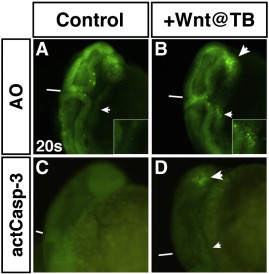 Increased Wnt signaling at the TB stage causes cell death independent of Caspase-3 activation. (A,C) HCSEs. (B,D) GFP + sibling embryos. (A,B) Embryos at 20 s with AO staining to detect dying cells. There is increased cell death in the LPM at 20 s after increasing Wnt signaling at TB (B; small arrowhead and inset) compared to HCSEs (A; arrow and inset). Significant cell death was also observed in the anterior neural tissue (large arrowhead in B). (C,D) Embryos at 20 s with whole mount immunohistochemical analysis of activated Caspase-3. (D) Activated Caspase-3 is not detected in the LPM where AO staining is observed at 20 s after increasing Wnt signaling at the TB stage (small arrowhead). However, there is substantial activated Caspase-3 detected in the anterior neural tissues (large arrowhead), which is also observed with AO staining (B). Views in A and B are dorso-lateral. Views C and D are lateral. Lines in A–D indicate the position of the midbrain–hindbrain boundary. CPs/CMs are located immediately posterior to this boundary in the LPM.