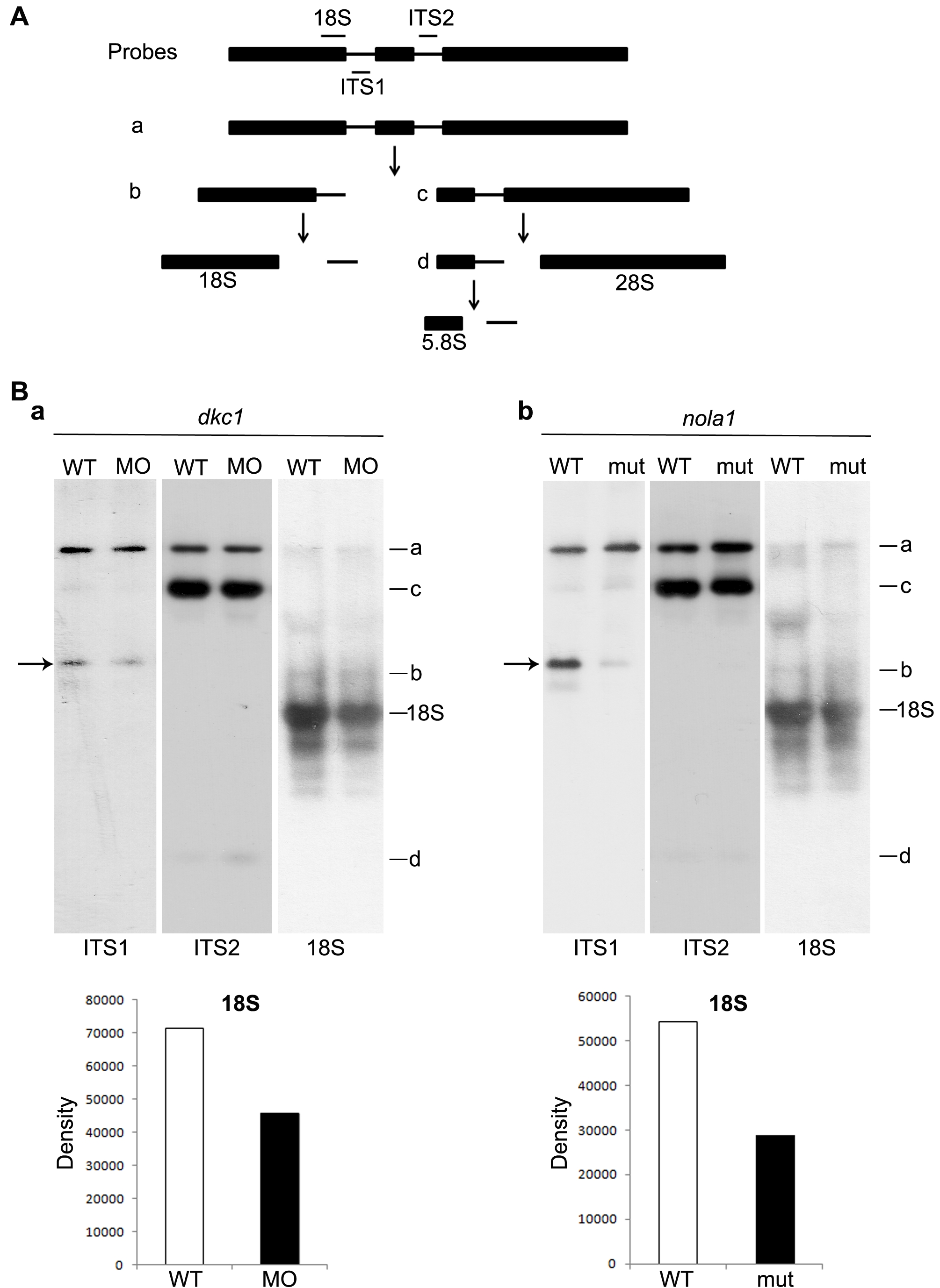 Deficiencies of both dkc1 and nola1 lead to the defects of rRNA processing. (A) Schematic figure modified from previous report [29] shows the overview of rRNA processing. (B) A significant decrease of a precursor strand generating ITS1 and 18 S rRNA was detected in the lanes probed with ITS1 in both dkc1 morphant and nola1 mutant compared with wild type controls (arrows in a and b). The total amount of 18 S rRNA was reduced significantly as shown in the lanes probed with 18 S rRNA probe. The intensity of staining of 18 S rRNA relative to the background was measured using ImageJ program. In contrast, no obvious difference was detected in the lanes probed with ITS2 probe.