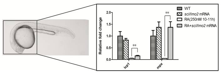 Fig. S2 qRT-PCR analysis shows overexpression of scl and lmo2 into zebrafish embryos partially rescues the defective primitive myelopoiesis in the embryos treated with 250 nM RA during 10–11 hpf. Embryos were treated with vehicle DMSO (WT), microinjected with scl and lmo2 mRNA at 1–2 cell stage (scl/lmo2 mRNA), treated with 250 nM RA during 10 to 11 hpf (250 nM RA 10–11 hpf), or microinjected with scl and lmo2 mRNA at 1–2-cell stage and then treated with 250 nM RA during 10 to 11hpf (RA+scl/lmo2 mRNA), respectively. To exclude the myeloid cells derived from ICM, embryos that were removed tails and trunks at 24 hpf were used to detect relative expression levels of myeloid markers lcp1 and mpx by qRT-PCR. Overexpression of scl and lmo2 did not change expression levels of lcp1 and mpx in wild type embryos but significantly rescued the inhibited expressions of lcp1 and mpx in the embryos treated with 250 nM during 10–11 hpf. **: P<0.01.