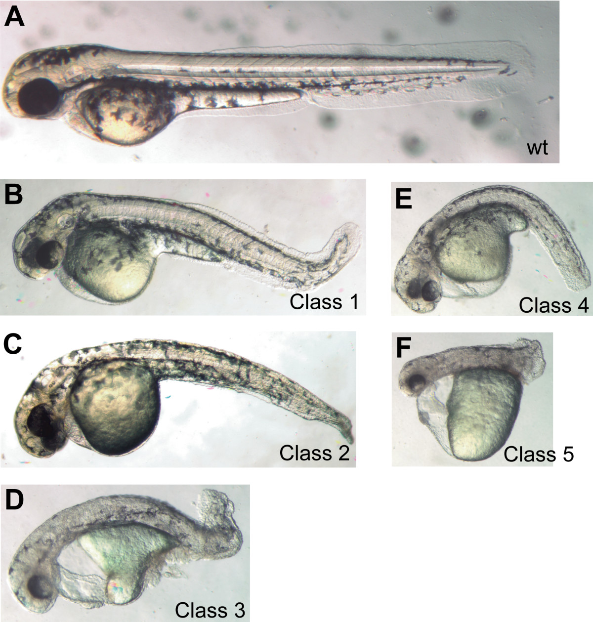 MO-induced knockdown of ZNF143 produces multiple phenotypes in zebrafish embryos. Zebrafish embryos were injected with a combination of "Start" and "5′UTR" morpholino oligonucleotides, each at 2 ng/nL. ZNF143 morphants at approximately 48 hpf are displayed according to increasing level of severity of axial development and other defects as described in the text (classified 1-5, respectively).