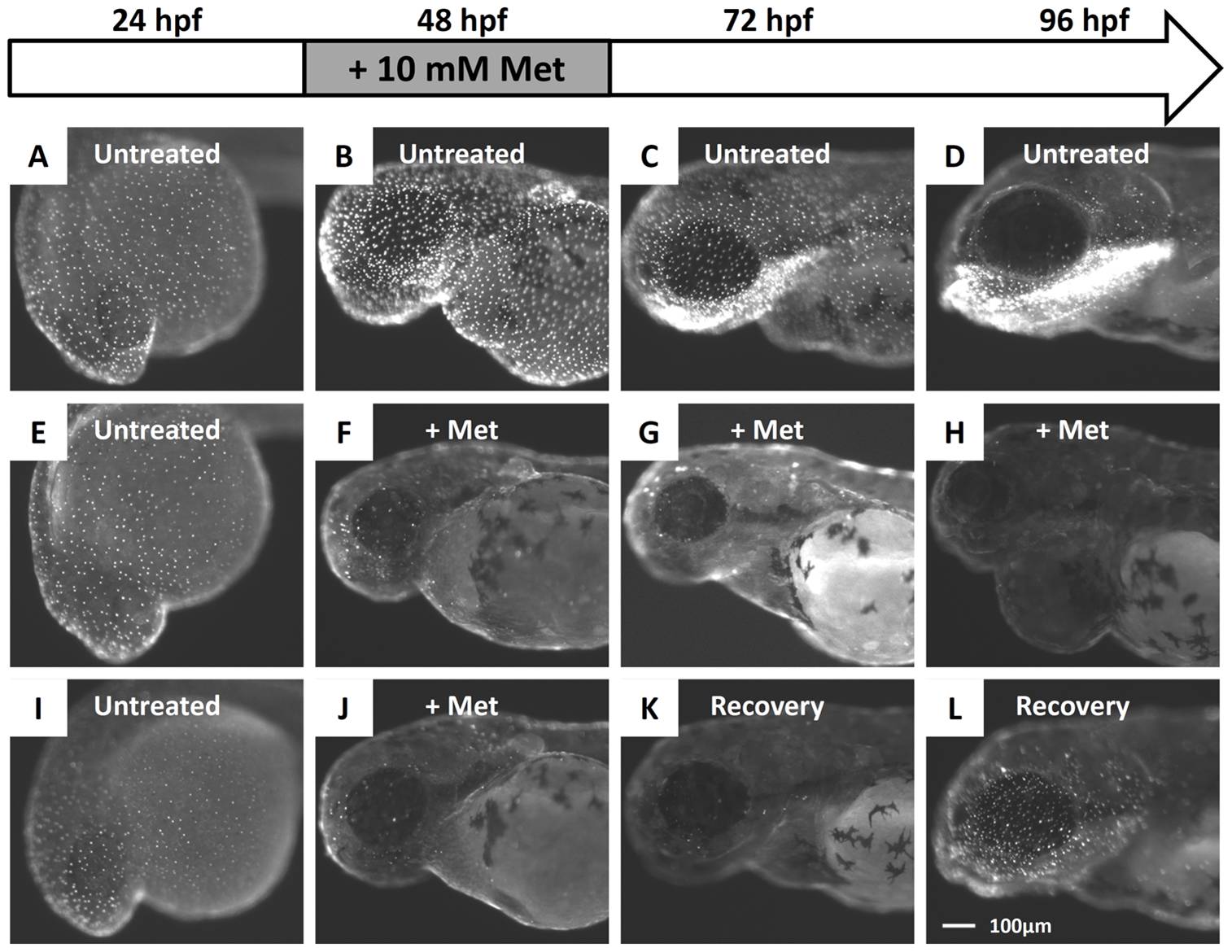 (A–D) The ontogenic expression of NTR-hKikGR fusion protein in killer line embryos aged from 24 hpf to 96 hpf. (E–H) Consecutive incubation of killer line embryos with 10 mM Met, from 24 hpf to 96 hpf, caused the NTR-hKikGR+ fluorescent signals to gradually diminish by 48 hpf, totally disappear by 72 hpf, and show pericardial edema in Met-treated embryos by 96 hpf. (I–L) If Met was withdrawn and replaced with fresh fish water from 48 hpf onwards, the NTR-hKikGR+ fluorescent signals partially restored by 96 hpf. Scale bar = 100 μm in L (applies to A–L). The experimental design and work flow are illustrated at the top panel. Met, metrodinazole.