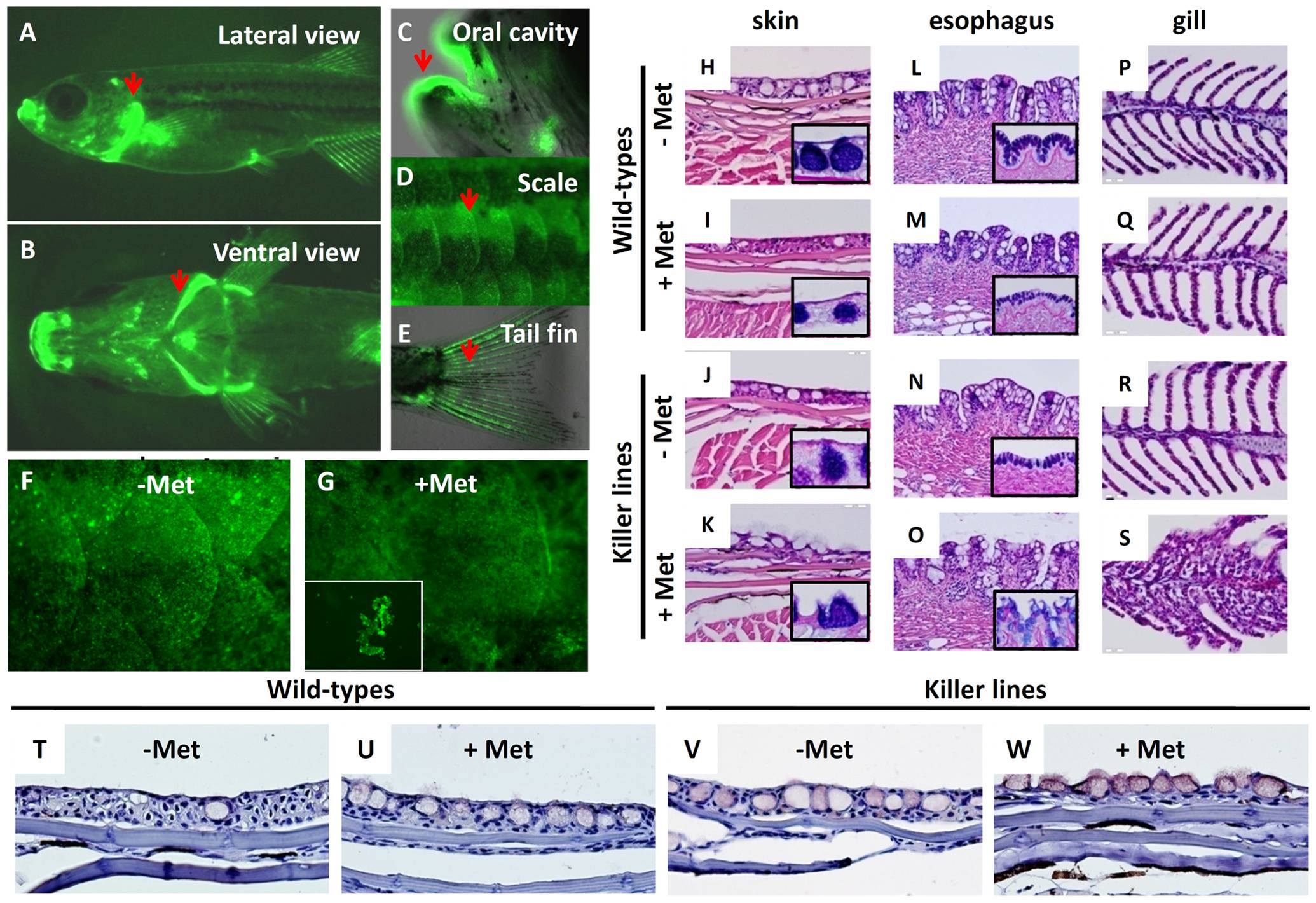 The lateral (A) and ventral (B) views of fluorescent appearance of NTR-hKikGR fusion protein in the killer line at adult stage. Some regions like gill operculum (A, B), oral cavity (C), scale (D) and tail fin (E), which are rich in epithelial structures, showed robust fluorescent signals (heighted by arrows). (F–G) Test of the possibility of performing skin ablation in the adult killer line. Treatment of the killer line with 2.5 mM Met for three consecutive days resulted in greatly compromised skin integrity and some detached skin debris (NTR-hKikGR+) in the fish tank. (H–S) Histological assessment of skin integrity in wild-types or killer lines treated with or without 2.5 mM Met. Paraffin sections stained with hematoxylin and eosin showing the serial morphological changes in the regions of superficial skin (H–K), esophagus (L–O) and gill epithelium (P–S). Included for comparison, the normal epidermal histology in superficial skin (H), esophagus (L) and gill (P) before performing skin ablation. To highlight the position of mucous cells, PAS staining (blue color) in paraffin sections derived from skin (H–K) and esophagus (L–O) shown in lower right corners. (T–W) Detection of cell apoptosis in the damaged skin by activated caspase 3 antibody staining on paraffin sections (brown signals). The killer line adults were first incubated with 2.5 mM Met solution for three consecutive days to execute cell ablation and then paraffin sections, at 5 μm intervals, were cut for histological assay or immunohistochemistry. Met, metrodinazole; PAS, Periodic Acid Schiff.
