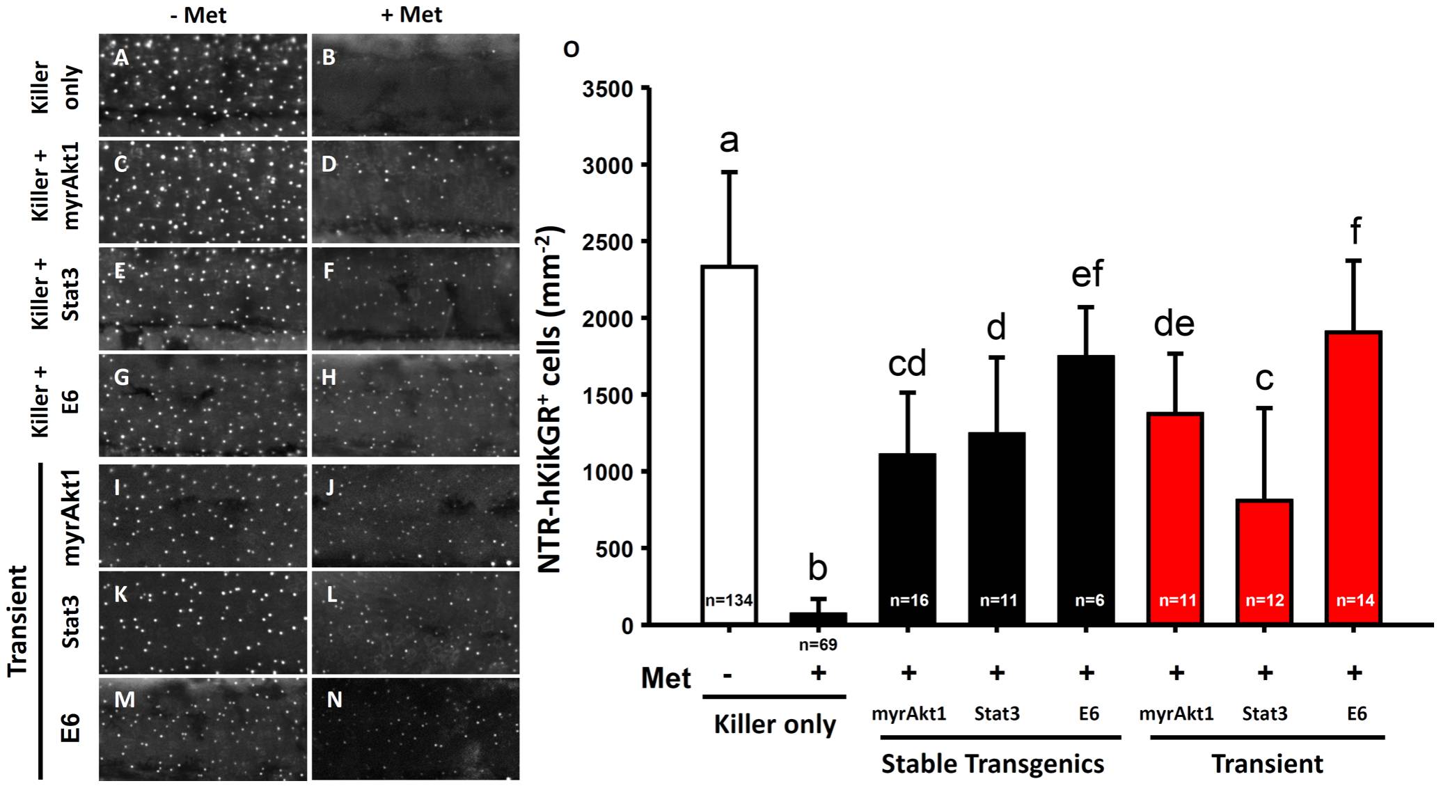 (A–H) The NTR-hKikGR+ fluorescent signals in embryos derived from crossing of killer line with testing line carrying human constitutively active Akt1 (myrAkt1) (C, D), mouse constitutively active Stat3 (Stat3) (E, F), or HPV16 E6 (E6) transgenes (G, H). (I–N) NTR-hKikGR+ fluorescent signals in killer line embryos after injection with plasmids carrying myrAkt1 (I, J), Stat3 (K, L), or E6 transgenes (M, N). (O) Statistical comparison of the relative number of NTR-hKikGR+ fluorescent signals in embryos derived from stable line assay (black bars) or transient assay (red bars). The cell number is presented as the mean±S.D. Different letters above the error bars indicate significant differences as tested using one-way ANOVA with Tukey′s pair-wise comparison method. Met, metrodinazole.