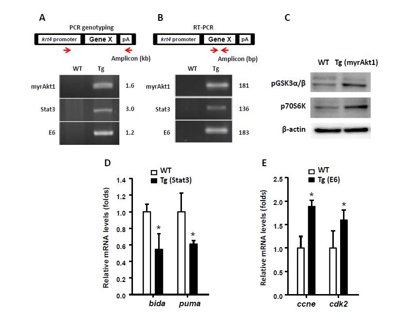 Fig. S1 Validation of the transmission, expression and function of testing lines in stable transgenics using genotyping, RT-PCR and Western blot analysis. Assay of the stable transmission and expression of transgenes in different testing lines at the DNA and mRNA levels by genotyping (A) and RT-PCR (B), respectively. The relative position of the primers used to perform genotyping or RT-PCR is illustrated by red arrows. The predicted amplicon size is also illustrated in the right panel. The plasmid architectures were highlighted in the upper panel. (C) Western blot assay on protein lysates extracted from adult tail fins showing highly phosphorylated Akt downstream targets of GSK3α/β and 70S6K in myrAkt1 testing line. β-actin served as a protein loading control. (D) Quantitative real-time RT-PCR showed that overexpression of pro-survival genes of Stat3 down-regulates the pro-apoptotic genes bida and puma in transgenic embryos aged at 48 hpf. (E) Quantitative real-time RT-PCR showed that overexpression of virus oncogene of HPV16 E6 up-regulates the cell cycle-related genes ccne and cdk2 in transgenic embryos aged at 48 hpf.