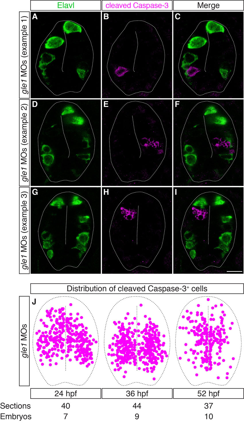 The distribution of cleaved caspase 3+ cells is mutually exclusive with that of differentiated neurons in Gle1-deficient embryos. (A-I) Transverse cryosections through the spinal cords of gle1 morphants were co-stained with anti-Elavl and anti-cleaved caspase 3 antibodies at 24 hpf. The cleaved caspase 3+ cells (B,E,H) are distributed widely along the dorsoventral axis of the spinal cord, often located close to the central canal or immediately adjacent to the basally located Elavl+ neurons (A,D,G). However, cleaved caspase 3+ and Elavl+ signals do not overlap (merged channels, C,F,I). Each image is a single optical section (<1 µm) extracted from the confocal z-stack with dorsal upward. Dashed lines outline spinal cords and central canals. Scale bar: 10 µm. (J) Distribution of the cleaved caspase 3+ cells in the transverse sections of the gle1 morphant spinal cords at 24, 36 and 52 hpf. Single confocal sections were manually superimposed and the positions of the cleaved caspase 3+ cells were marked. The cleaved caspase 3+ cells are distributed widely along both the dorsoventral and apical-basal axes of the spinal cord.