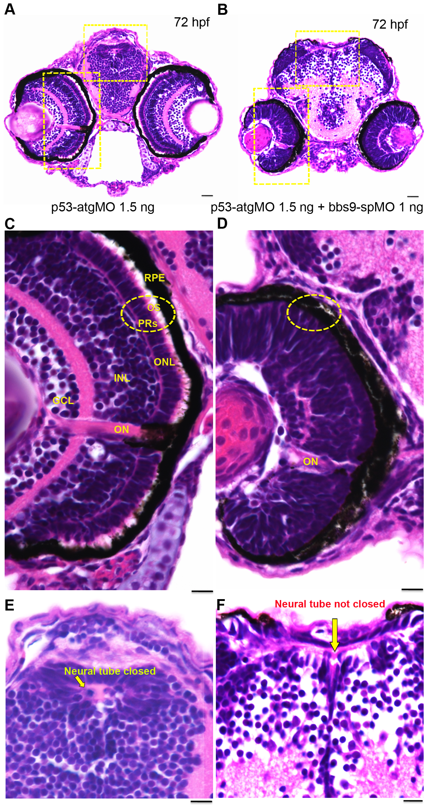Zebrafish head sections (72 hfp) stained with H& E. (A) The morphant injected with p53-atgMO (1.5 ng) shows normal retinal lamination and neural tube (areas highlighted with hatched yellow rectangles). (B) The morphant co-injected with bbs9-spMO (1 ng) and p53-atgMO (1.5 ng) shows lack of retinal lamination and incomplete closure of neural tube (areas highlighted with hatched yellow rectangles). (C) The morphant retina in higher magnification - area boxed in ‘A’. The retina shows all the 5 layers: Retinal pigment epithelium (RPE) abutting close to photoreceptors (PRs). The PRs (hatched circle) have visible outer segments (OS). Next to PRs are the outer nuclear layer (ONL) followed by an intact inner nuclear layer (INL) and the ganglion cell layer (GCL). The optical nerve (ON) is used as a reference point. (D) The bbs9-spMO injected morphant retina in higher magnification - area boxed in ‘B’. The retina shows no clear lamination and it lacks photoreceptor outer segments (hatched circle). (E) The morphant neural tube in higher magnification from ‘A’ shows normal closure (arrow). (F) The bbs9-spMO injected morphant neural tube in higher magnification from ‘B’ shows incomplete closure of neural tube (arrow). The scale bars indicate 100 μm.