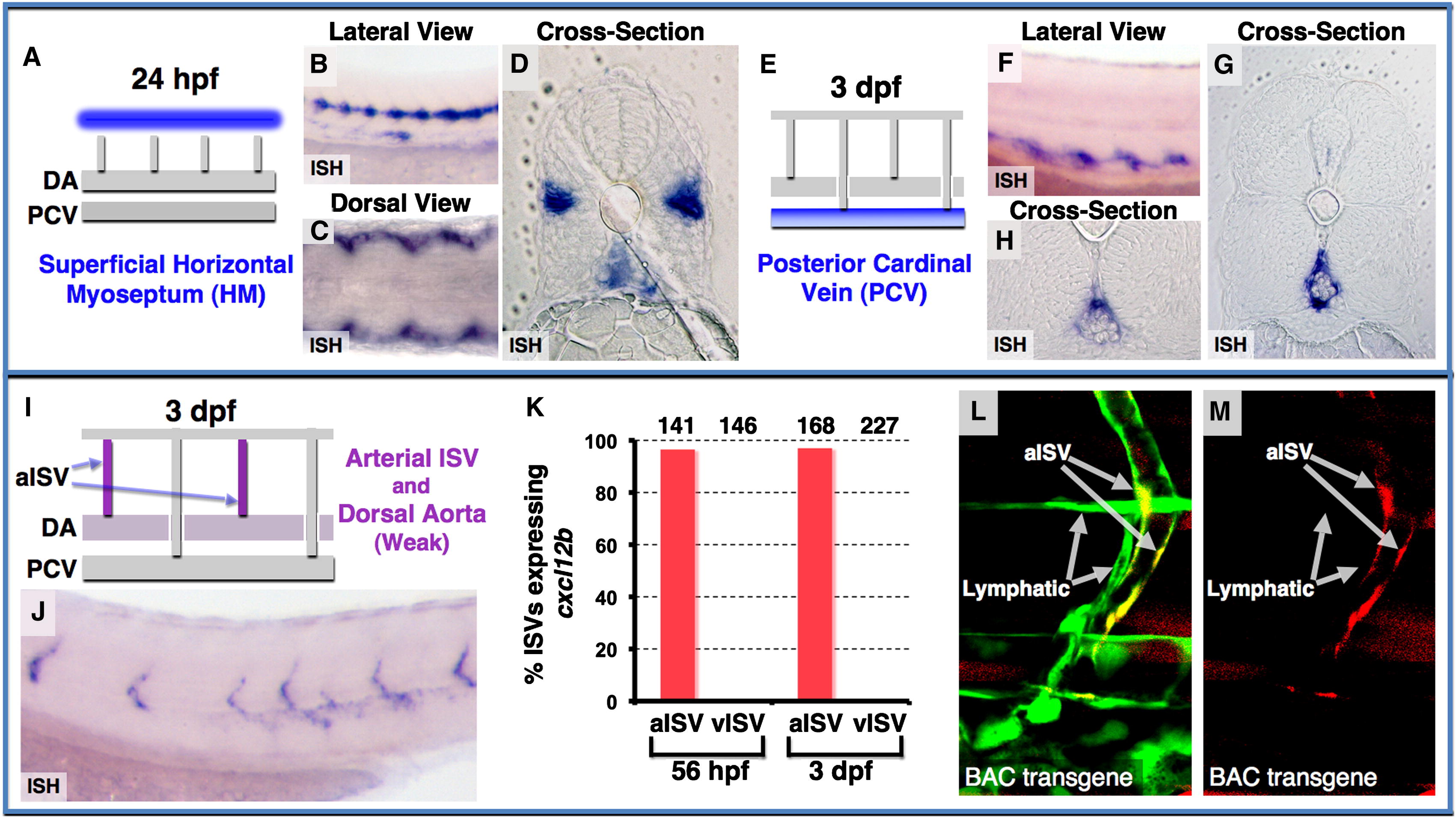 Chemokine Ligand Cxcl12 Expression in the Developing Zebrafish Trunk (A–D) Cxcl12a expression in the superficial HM at 24 hpf, as shown in diagram (blue in A), and in WISH lateral view (B), dorsal view (C), and cross-section (D). (E–H) Cxcl12a expression in the PCV at 3 dpf, as shown in diagram (blue in E), and in WISH lateral view (F) and cross-sections (G and H). (I and J) Cxcl12b expression in the aISV and DA, as shown in diagram (magenta in I) and in WISH lateral view image (J) at 3 dpf. (K) Quantification of aISV and vISV (determined by direction of blood flow and by connection to either the DA or PCV as shown in Movie S2) expressing cxcl12b at 56 hpf and 3 dpf. Numbers of counted aISVs or vISVs at each time point are indicated above the bars. (L and M) Confocal images of mid-to-ventral trunk vessels in a 3 dpf Tg(fli1a:EGFP)y1 embryo (green) injected with a recombineered BAC clone with TagRFP-T driven by the cxcl12b promoter (red), showing green and red fluorescence together (L), or red fluorescence only (M). TagRFP-T expression is present in aISVs, but not in adjacent LVs. See also Figure S3.