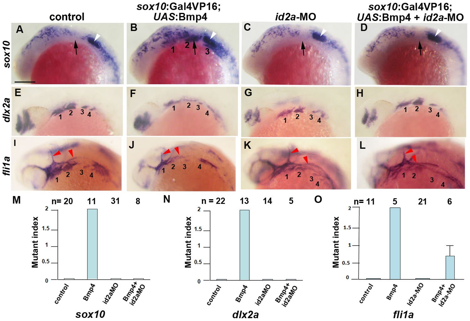 (A–L) Colorimetric in situs show ectopic sox10 arch expression at 18 hpf and reductions of dlx2a and fli1a arch expression at 24 hpf in sox10:Gal4VP16; UAS:Bmp4 embryos but not sox10:Gal4VP16 control or id2a-MO-injected embryos. sox10:Gal4VP16; UAS:Bmp4 embryos injected with id2a-MO showed complete rescue of sox10 and dlx2a expression and partial rescue of fli1a expression. Arches are numbered and arrows denote the second arch, white arrowheads the developing ear, and red arrowheads the vasculature. Scale bar = 50 μm. (M–O) Quantification of gene expression defects. The mutant index is based on the following: 0 = normal, 1 = partially defective, 2 = fully defective. Fully defective was defined as gene expression being of equal intensity to that seen in un-injected sox10:Gal4VP16; UAS:Bmp4 embryos. For sox10, partially defective was defined as a reduction in the number of expressing cells and/or the intensity of arch expression compared to un-injected sox10:Gal4VP16; UAS:Bmp4 embryos. For fli1a and dlx2a, partially defective was defined as a level of arch expression intermediate between un-injected sox10:Gal4VP16; UAS:Bmp4 and sox10:Gal4VP16 control embryos. The rescue of Bmp4 misexpression defects with id2a-MO injection was statistically significant for all genes based on a Tukey-Kramer HSD test (α = 0.05). Standard errors of the mean are shown.