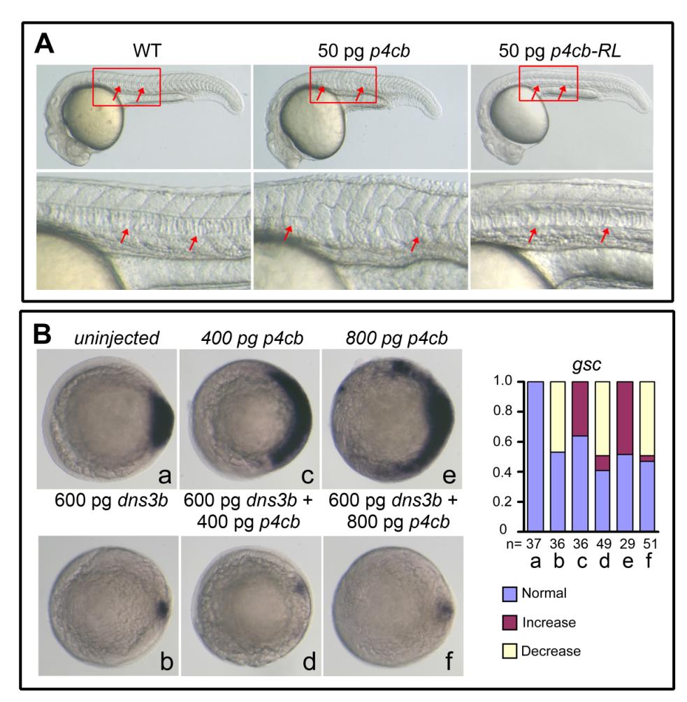 Effects of ppp4cb or its mutant overexpression, related to Figure 2. (A) 50 pg of ppp4cb mRNA (p4cb) or ppp4cb-RL mRNA (p4cb-RL) encoding the phosphatase-dead mutant form of Ppp4cb was injected at the one-cell stage and injected embryos were observed at 24 hpf. Boxed areas were enlarged to see the notochord that was indicated by arrows. p4cb overexpression interrupted the notochord development, but p4cb-RL overexpression did not cause any detectable morphological defects, which suggests that the phosphatase activity of Ppp4c is required for Ppp4c function in zebrafish embryos. (B) The embryos were injected at the one-cell stage with indicated mRNAs and examined for gsc expression at the shield stage. The statistical data were shown in the right. Notably, higher doses of ppp4cb mRNA resulted in an expansion of gsc, which was inhibited by co-injection of dnsmad3b mRNA encoding the dominant negative form of Smad2/3 (Jia et al. 2008), suggesting that too much Ppp4cb enhances Smad2/3 activity.