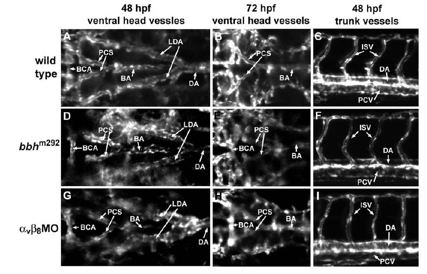 Confocal images were taken in the ventral head at 48 hpf (A, D, G) and 72 hpf (B, E, H), and the lateral midtrunk at 48 hpf (C, F, I). The basic vascular pattern is similar in wild types (A, B, C), bbh mutants (D, E, F) and α v β8 double morphants (G, H, I). BCA: basal communicating artery; PCS: posterior communicating segment; BA: basilar artery; LDA: lateral dorsal aorta; DA: dorsal aorta; ISV: intersegmental vessel; PCV: posterior cardinal vein.