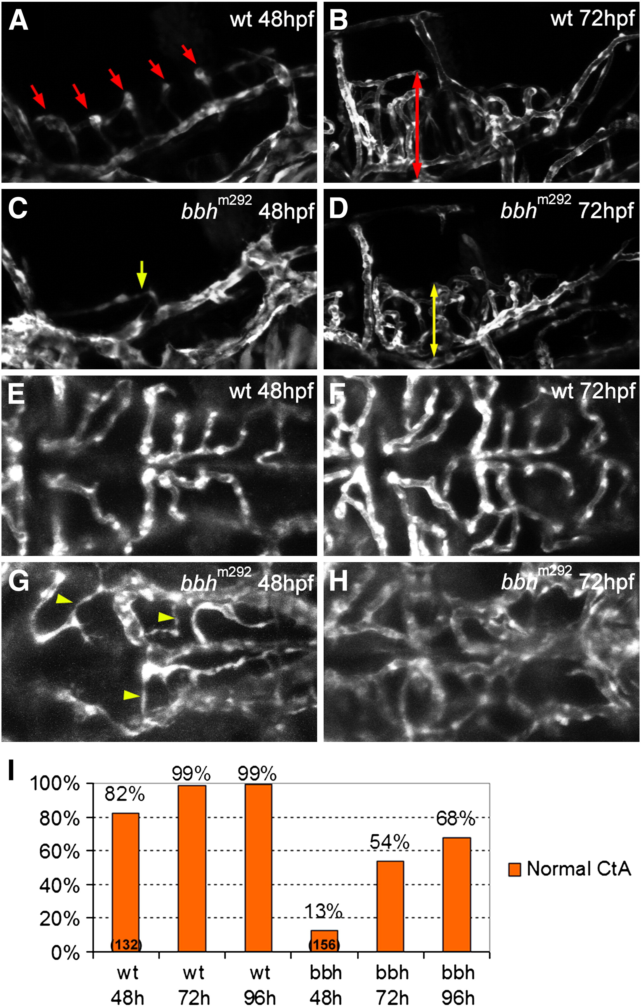 Fig. 5 Defective hindbrain angiogenesis in bbhm292 mutants. (A) At 48 hpf, a lateral view of the hindbrain of the wild type embryo shows central arteries (CtA, red arrows) sprouting from posterior communicating segment (PCS) and basilar artery (BA) and draining into primordial hindbrain channel (PHBC) (B) At 72 hpf, the CtAs penetrate deeply into the hindbrain in wild type embryos (red double-headed arrow). (C) 48 hpf bbh homozygous mutants show a reduced number and atypical growth direction of the CtAs (yellow arrows). (D) At 72 hpf, the CtAs in bbh homozygotes invade into the hindbrain matter, but have reduced length as compared to wild type embryos (yellow double-headed arrow). (E) In a dorsal view regular, lumenized CtA are observed in 48 hpf wild type embryos. (F) At 72 hpf, the basic network structure of the CtA remains similar, although is more refined. (G) In contrast, 48 hpf bbh homozygotes show a reduced number of CtAs, with very irregular morphology (yellow arrowhead). (H) At 72 hpf, the structure of CtA vasculature in bbh homozygotes has an irregular morphology with abnormal connections and irregular vessel size. (I) Quantitation of the percentage normal CtAs at 48, 72 and 96 hpf in wild type embryos (wt) and bbh homozygotes (bbh).