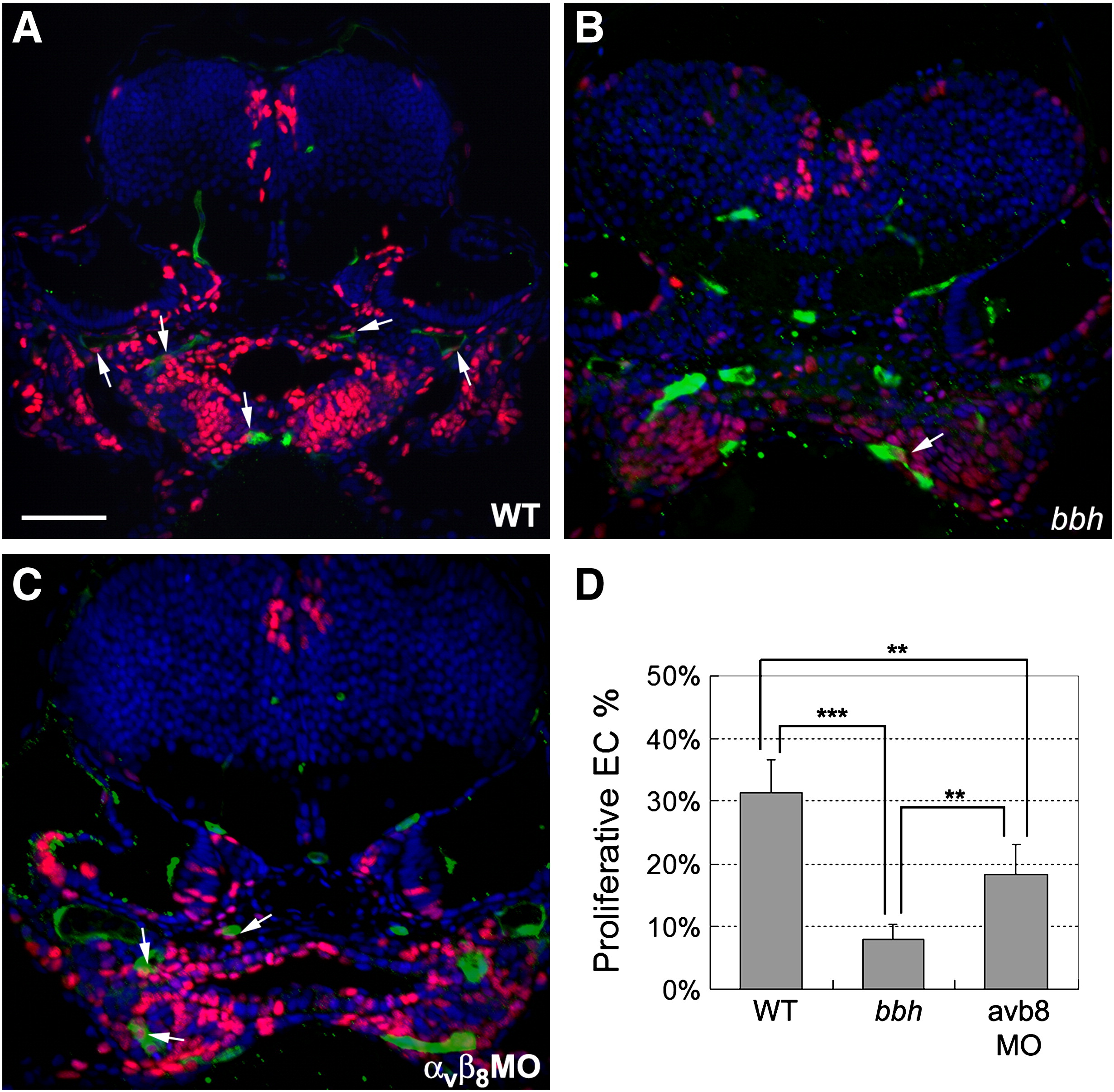Fig. 8 Defective endothelial cell proliferation in bbh mutants and integrin αvβ8 double morphants. (A–C) Cell proliferation was detected by pulsing with EdU at 48 hpf and fixation at 54 hpf (red), while endothelial cells are marked by expression of GFP in the Tg(kdrl:eGFP)la116 line (green) and nuclei are stained with DAPI (blue). In general, higher levels of EdU incorporation are detected in wild type embryos (A) as compared to bbh homozygotes (B) or and integrin αvβ8 double morphants (C). Arrows highlight proliferative endothelial cells. (D) The percentage of proliferative endothelial cells were analyzed from the percentage of cells with co-staining of EdU and GFP vs. the total number of GFP cells as observed on sections from 5 wild types, 5 bbh homozygotes, and 5 integrin αvβ8 double morphants. Significance was determined by a Student′s t test, where ** represents p < 0.005, and *** represents p < 0.001.