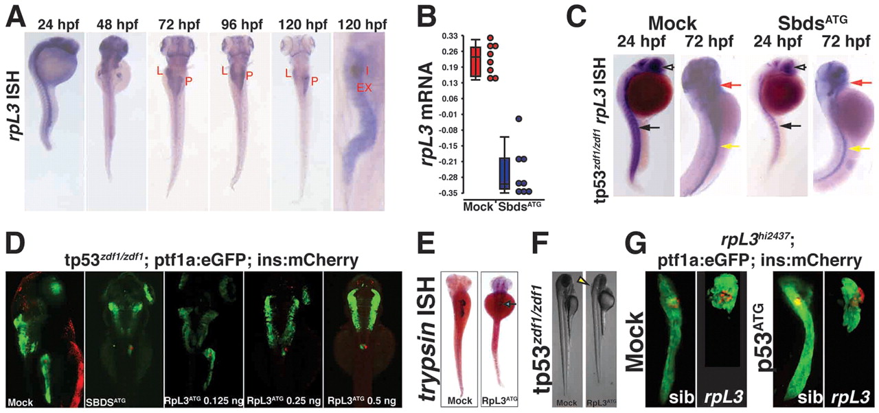Fig. 5 Knockdown of rpl3 phenocopies SbdsATG MO-induced defects in pancreas development. (A) Expression of rpl3 is widespread at 24 hpf and becomes progressively restricted to the endoderm, with high-level pancreatic expression at 120 hpf. The principal islet (I) is labeled by in situ hybridization for insulin (red). (B) rpl3 expression is decreased in SbdsATG MO-injected embryos, as quantified by microarray analysis of transcript abundance. Error bars indicate s.e.m. (C) In situ hybridization for rpl3 in SbdsATG MO-injected p53zdf1/zdf1 embryos confirms loss of rpl3 expression in somites (black arrows), central nervous system (white arrows), pharyngeal arches (red arrows) and intestine (yellow arrows) of developing embryos. (D) An MO dose-dependent defect in pancreas progenitor expansion was observed in Rpl3ATG MO-injected ptf1a:eGFP;ins:mCherry;p53zdf1/zdf1 embryos. (E) The small pancreas (arrow) of p53zdf1/zdf1 embryos injected with 0.5 ng Rpl3ATG MO is positive for trypsin expression by in situ hybridization. (F) p53zdf1/zdf1 embryos injected with 0.5 ng Rpl3ATG MO at 72 hpf exhibit small heads and hydroencephaly (yellow arrowhead). (G) rpl3hi2437/+;ptf1a:eGFP;ins:mCherry heterozygotes bearing a mutagenic rpl3 transgenic insertion were incrossed. rpl3hi2437/hi2437 homozygous embryos displayed disrupted pancreas progenitor expansion at 72 hpf. Injection of rpl3hi2437;ptf1a:eGFP;ins:mCherry with the p53ATG MO did not rescue the pancreatic progenitor phenotype of homozygous rpl3hi2437hi/2437 embryos. L, liver; P, pancreas; I, islet; Ex, exocrine pancreas.