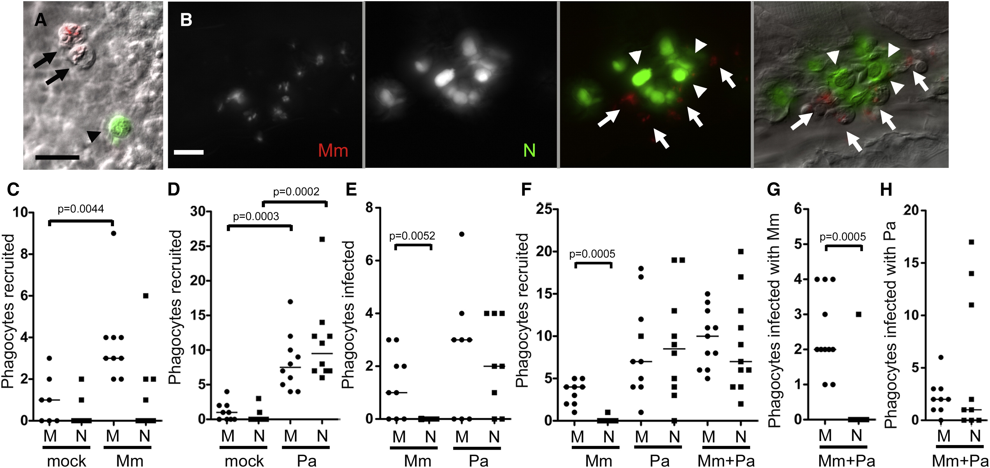 Neutrophils Are Poorly Recruited to the Initial Site of Mycobacterial Infection and Do Not Phagocytose Mycobacteria (A) Fluorescence and DIC overlay of macrophages infected with red fluorescent Mm (arrows) and a green fluorescent neutrophil (arrowhead) 10 min after caudal vein injection of 48 hpf larva. Scale bar, 10 μm. (B) Infected macrophages (arrows) and uninfected neutrophils (arrowheads) 24 hr after Mm injection into caudal vein of 48 hpf larva. Scale bar, 20 μm. (C–H) Median number of phagocytes recruited to, and infected in, the HBV of 48 hpf larvae 6 hr postinfection of vehicle (mock), (C) 108 Mm, (D) 45 Pa, (E) 108 Mm or 18 Pa, and (F–H) 27 Mm and 22 Pa together. M, macrophage, N, neutrophil. Results in (C)–(H) are each representative of more than three experiments. p value determined by Mann-Whitney rank test. (Also see Figure S1 and Movie S1.)