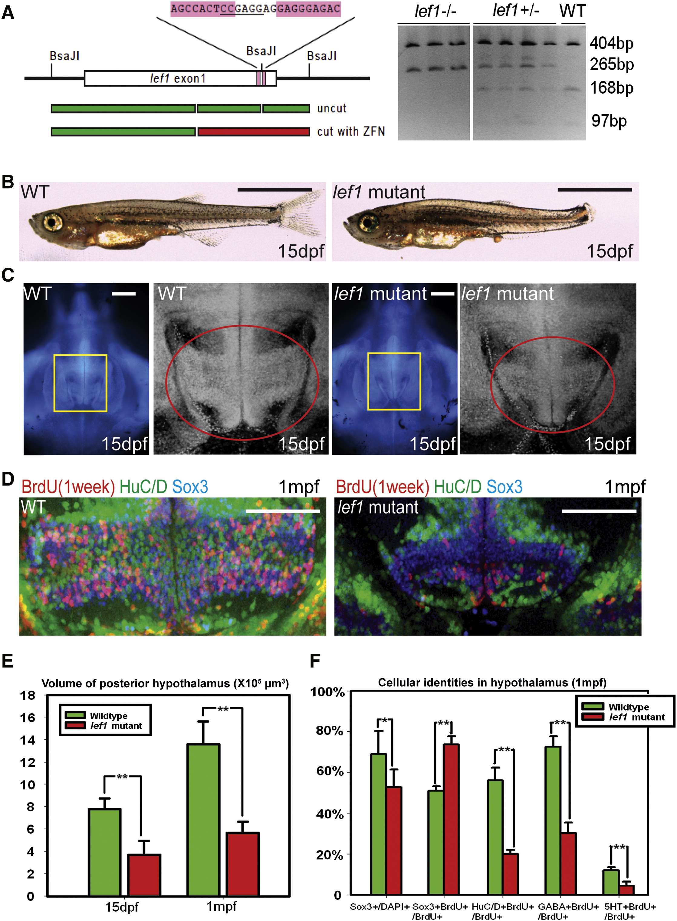 lef1 Is Required for Proliferation and Neurogenesis in the Postembryonic Hypothalamus (A) lef1 ZFN target region and genotyping. (B and C) Whole fish (B) and brain size (C) comparisons of lef1 mutant to wild-type at 15 dpf. Boxed region in left panel is enlarged on right, posterior recess is circled. (D) Expression of HuC/D, Sox3, and 7-day BrdU labeling in posterior recess of wild-type and lef1 mutant hypothalamus. (E) Quantification of posterior hypothalamus size. (F) Tracing of proliferating cells. lef1 mutants have a smaller Sox3+ progenitor pool, but a higher percentage of BrdU+ cells express Sox3 and fewer produce HuC/D+, GABA+, or 5HT+ neurons. Single optical sections from ventral views are shown in (C) and (D). Scale bars represent 2 mm (B), 200 μm (C), and 100 μm (D). Brain volumes were calculated using Amira software. Cell counts were collected from maximum intensity Z projections through the posterior recess of three individual samples for each genotype and calculated using Volocity software. *p < 0.05, **p < 0.005. Error = ±SD. See also Figure S3.