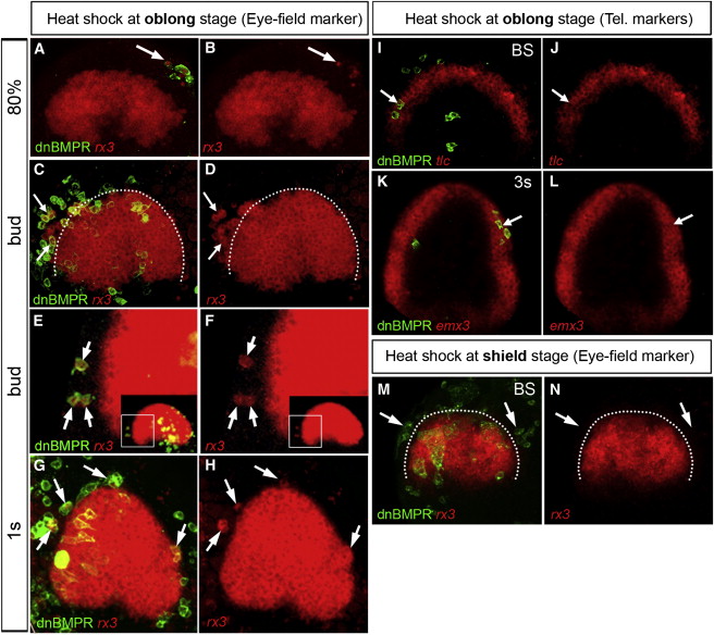Mosaic BMP Loss of Function at Early Stages inside the Telencephalon Results in Ectopic Expression of rx3 Embryos were injected with HSP70:dnBMPr plasmid at one- to two-cell stage followed by heat shock at oblong stage/early blastula (A–L) and shield stage/early gastrulation (M and N), respectively. The arrows in (A)–(H) mark cells with ectopic rx3 expression at stages indicated. (E and F) Close-up of the boxed area marked in the inset. (I–L) Expression of telencephalic (Tel.) markers, tlc and emx3, is maintained in dnBMPr-expressing cells (arrows in I–L). (M and N) Heat shock at 50% epiboly/early gastrulation does not result in ectopic rx3 expression (arrows in M and N). All views are dorsal, anterior at the top. White dotted lines in (C), (D), (M), and (N) mark the border of the eye field. All figures are z-projections of confocal sections. 1s, one-somite stage.