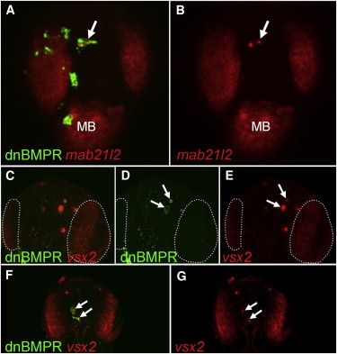 Ectopic Expression of Retinal Markers in BMP-Depleted Telencephalic Cells at 24 hpf (A–G) Embryos were injected with HSP70:dnBMPr plasmid at one- to two-cell stage followed by heat shock at oblong/early blastula stage. The arrows indicate dnBMPr-positive cells in the telencephalon at 24 hr, which ectopically express retinal markers mab21l2 (A and B) and vsx2 (C–G). The number of transiently transgenic dnBMPr cells is significantly lower at 24 hpf than at earlier stages, and the remaining transgenic cells frequently undergo apoptosis (arrows in D). (C–E) White dotted lines mark the vsx2-positive retina. All views are dorsal, anterior at the top. All figures are z-projections of confocal sections. MB, midbrain.