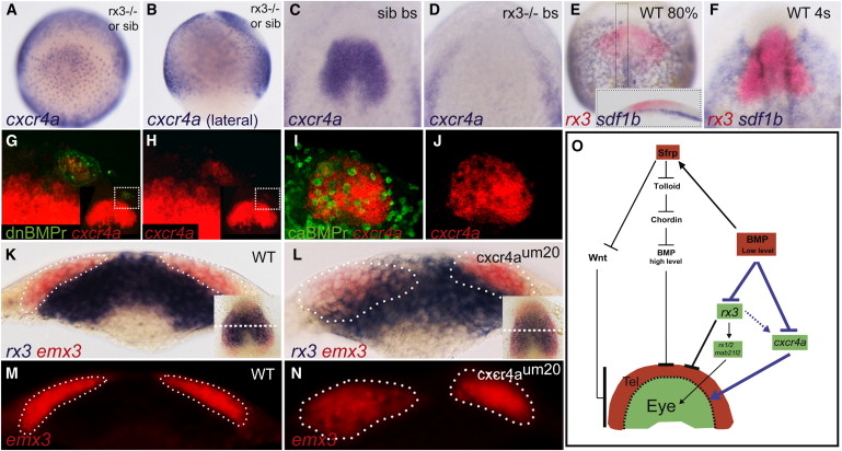 The Chemokine Receptor cxcr4a Demarcates the Border of the Eye Field and Telencephalon Downstream of BMP and Rx3(A–D) Cxcr4a expression in rx3/ or sib at 80% epiboly (A and B) and at bud stage in sib (C) and rx3/ (D) embryos. Sdf1b/rx3 double in situ at 80% epiboly/midgastrula stage (E) and four-somite stage (4s) (F). Inset in (E) shows a sagittal section of the boxed area, anterior to the left.(G–J) Cxcr4a transcript expression (red) in dnBMPr transgenic mosaics (green in G and H) and caBMPr transgenic mosaics (green in I and J) at bud stage. (G and H) Close-up of the boxed area marked in the inset. (I and J) Repression of cxcr4a expression in caBMPr-overexpressing cells.(K–N) Cross-section at medial A-P level of the eye field (dashed line in the insets in K and L). Segregation of rx3 (blue) and emx3 (red) expression domains in WT (K and M) and cxcr4aum20+/ x cxcr4aum20+/ crosses (L and N; n = 14/61) at four-somite stage. Dotted lines mark the border of emx3-expressing cells as defined by fluorescent images (M and N).(O) A model of the genetic network leading to formation of the eye and telencephalon. Blue arrows demonstrate the present work. Dotted-arrow line indicates that Rx3 is not essential for induction but for maintenance of cxcr4a expression.