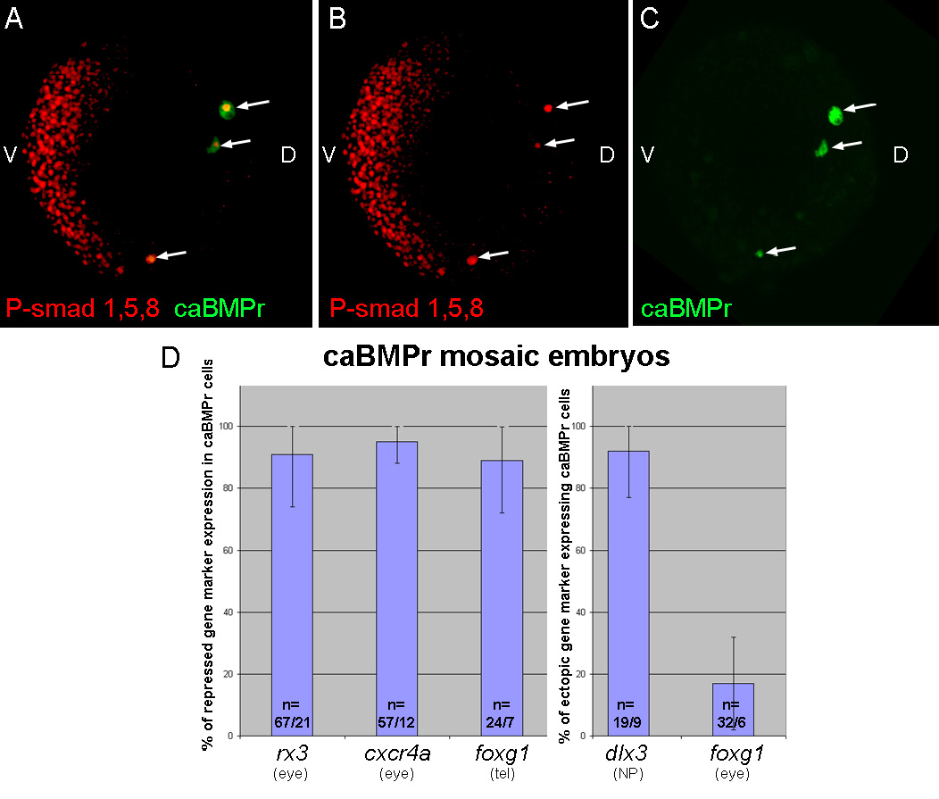 Fig. s4 High levels of Psmad1,5,8 are induced cell autonomously in caBMPr transgenic cells causing robust changes of neural marker expression (A-C) Animal view of a mid gastrula caBMPr mosaic embryo stained for P-smad1,5,8 in red, shield to the right. Arrows point to single caBMPr-transgenic cells (green cells) in the dorsal half of the embryo which ectopically induce nuclear P-smad1,5,8 (red) in a cell autonomous manner. (D) Statistical analysis of repressed and induced gene expression in caBMPr cells, respectively. n=number of cells/ number of embryos. (tel, telencephalon; NP, neural plate).